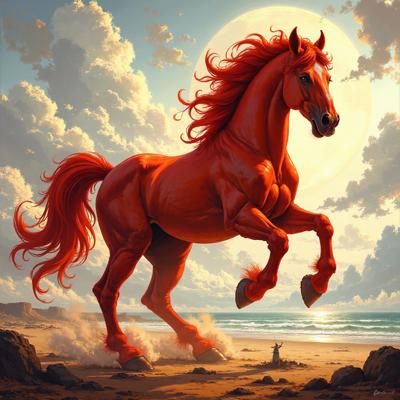 Красная огненная лошадь стоит и встала на задние копыта. Много энергии и динамики