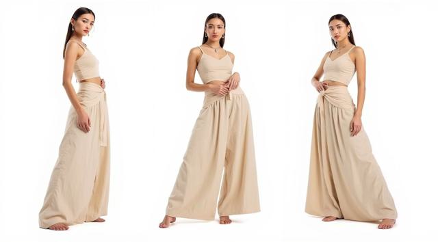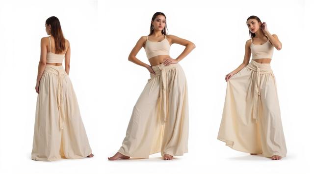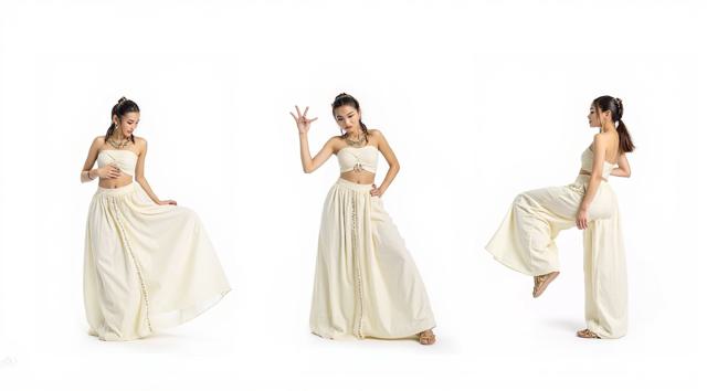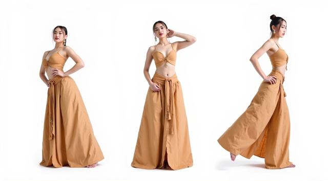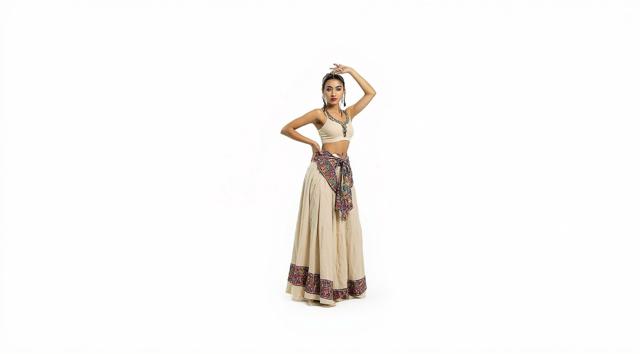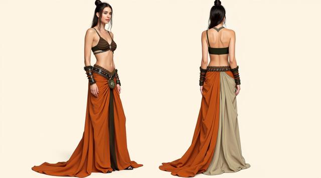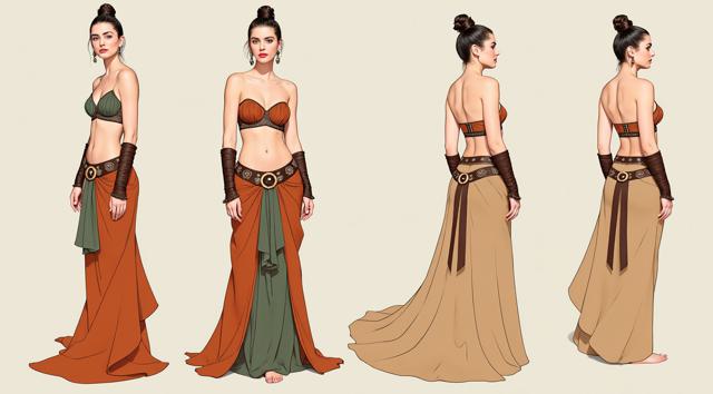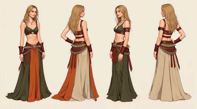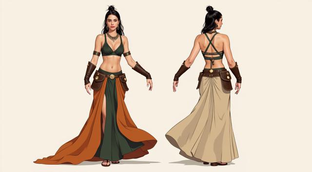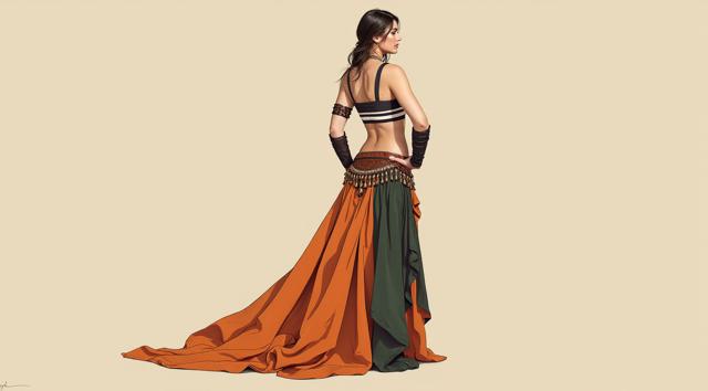 Дизайн костюма для танца живота, concept art. Простой полосатый топ из хлопка и длинная широкая юбка из легкой ткани. Стиль воинственной амазонки : кожаные наручи на запястьях, широкий кожаный пояс на бедрах, драпировки. Цветовая палитра: охра, темно-зеленый, терракотовый, песочный. Никаких страз, блесток или пайеток. Эскиз в стиле фэшн-иллюстрации, динамичная поза танцовщицы.