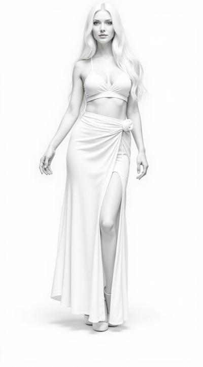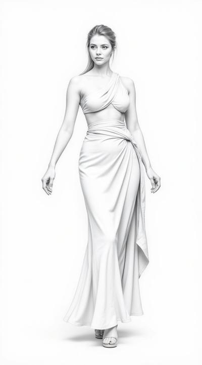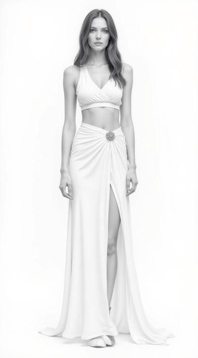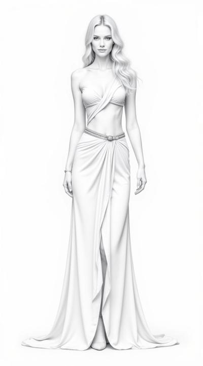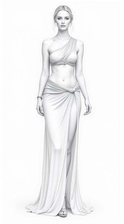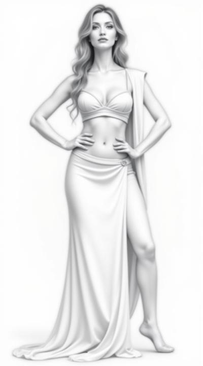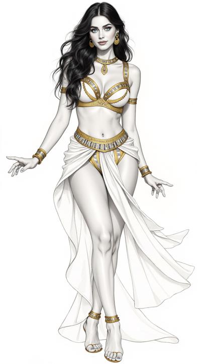 Карандашный скетч эскиза костюма для восточных танцев. Стиль: богиня Бастет. Легкие, струящиеся ткани., , Костюм: Асимметричный кроп-топ с драпировкой, длинная юбка с высоким разрезом, пояс-палет. Линии простые, для легкого пошива., , Модель: Фигуристая, светлая кожа. Поза в движении танца. Длинные темные кудри, голубые глаза., , Детали: Египетские украшения (браслеты, ободок с лунным диском). Легкая штриховка, акцент на складках ткани и динамике.