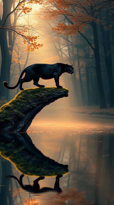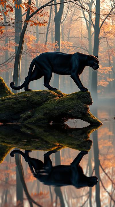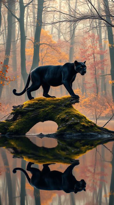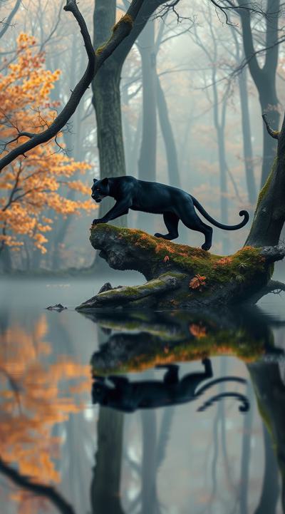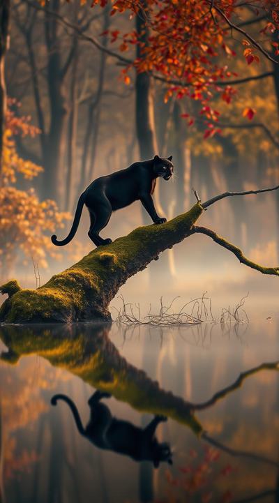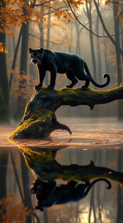 masterpiece, best quality, detailed wallpaper, 8K, soft morning light at dawn, a graceful sleek black panther walking confidently on a moss-covered, partially submerged tree in a misty autumn forest, the scene is reflected in the calm water, warm and muted autumn palette of gold, ochre, crimson, and deep green, in the distance, the faint lights of a quiet city or a solitary lighthouse are visible through the fog, atmosphere of serene calm, mysterious femininity, strong willpower, and peaceful solitude, droplets of recent rain glistening on leaves and moss, ethereal, cinematic, fantasy art