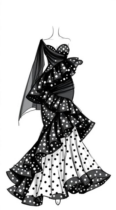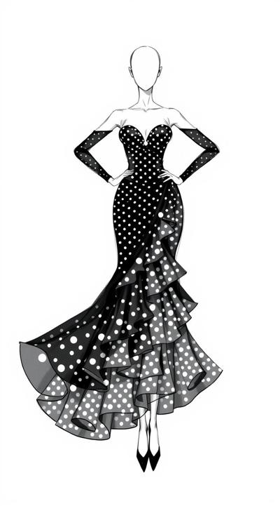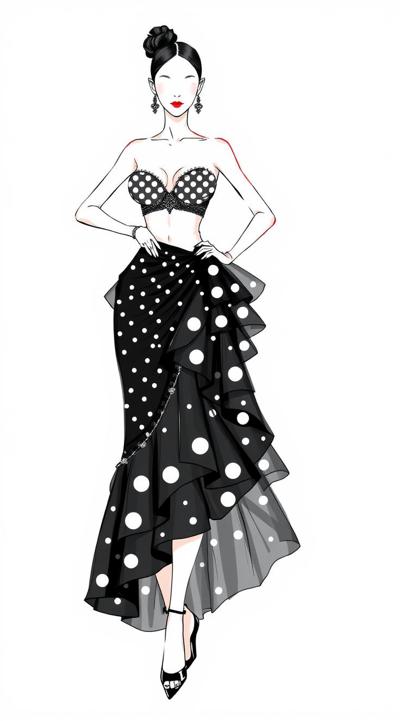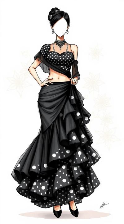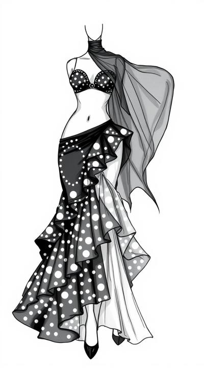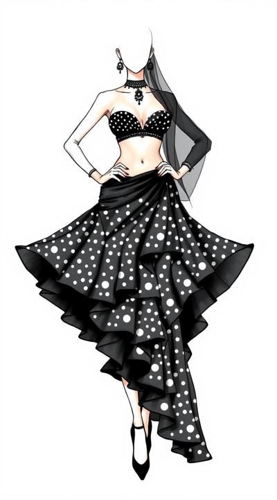 Fashion design sketch of a fusion belly dance costume. The concept combines Spanish flamenco and Oriental dance. Details: 1) Skirt: black with white polka dots, a dramatic diagonal ruffle starts at the hem and ascends to the hip, half of the ruffle is veiled with sleek black chiffon. 2) Top: a structured, elegant off-the-shoulder blouse inspired by Spanish tra