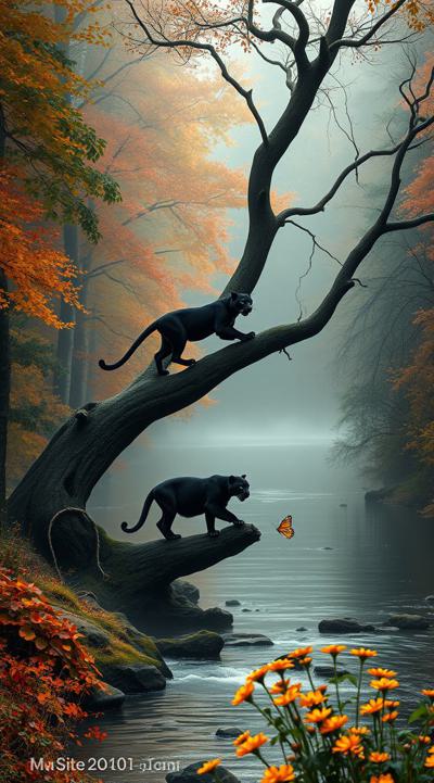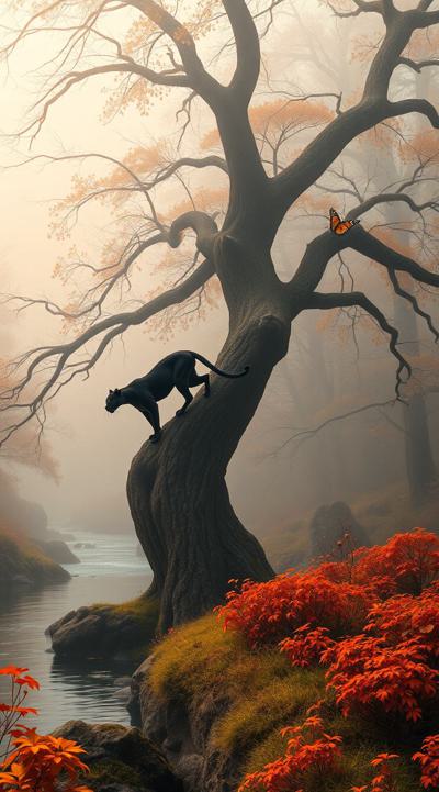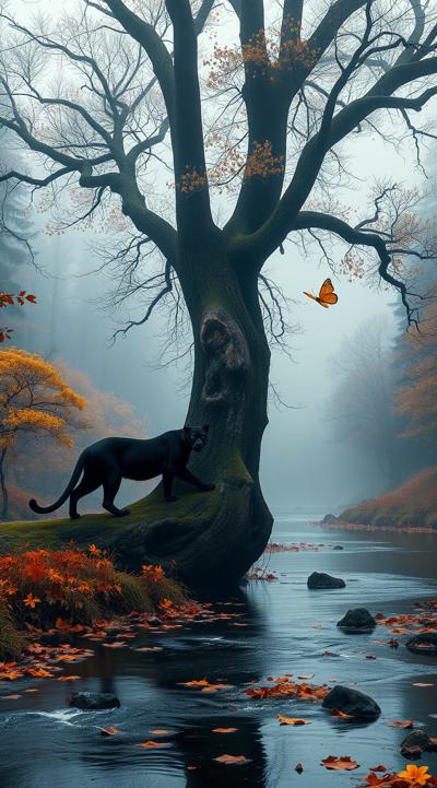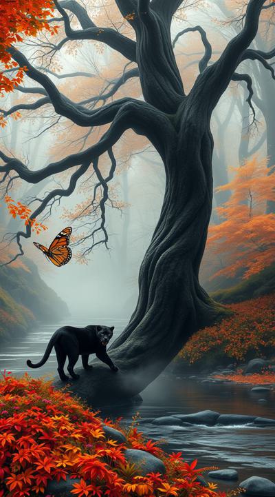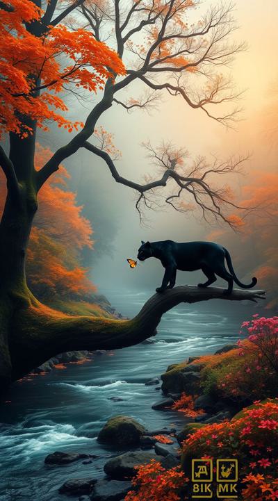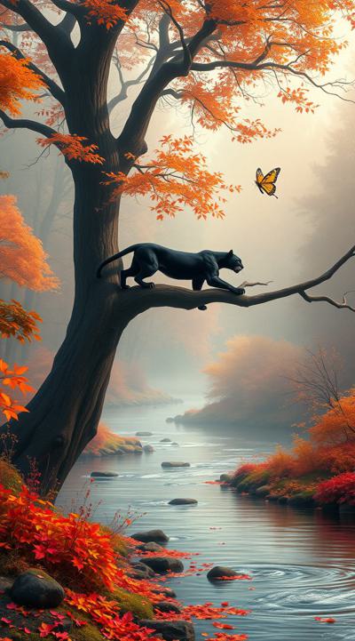 masterpiece, best quality, wallpaper, (warm and vibrant autumn palette:1.3), misty morning in an enchanted forest, a mystical river, on the river a thick tree grows horizontally, a sleek black panther is walking gracefully along the tree, following a bright yellow butterfly, vibrant autumn flowers on the riverbank, reflections in the water, magical atmosphere, ethereal, cinematic lighting, highly detailed, sharp focus, fantasy art, trending on artstation