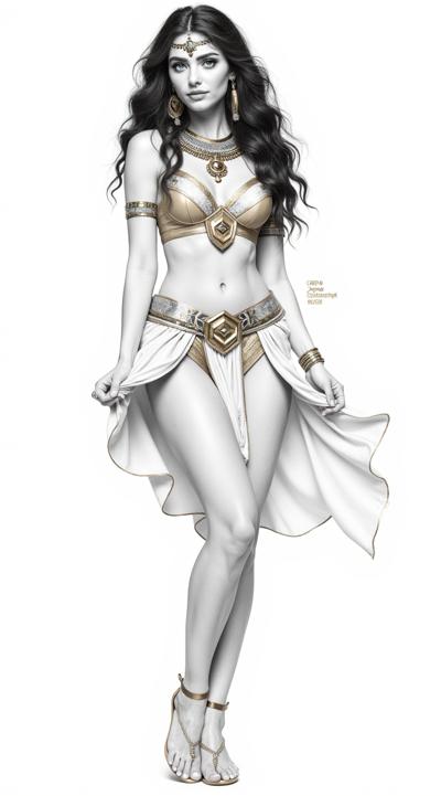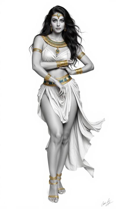 Эскиз карандашом для восточного танца: костюм богини Бастет. Фигуристая танцовщица со светлой кожей, пышными темными кудрями и голубыми глазами. Костюм состоит из лифа с золотыми деталями, напоминающими древнеегипетские украшения, и поясной юбки-пояса с развевающимися легкими полосами ткани. Элементы кошачьей тематики: ушки в волосах, стилизованный хвост, рисунок на ткани в виде крыльев сокола или кошачьих глаз. Динамичная поза танца, мягкая карандашная штриховка, акцент на изгибах тела и деталях костюма.