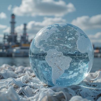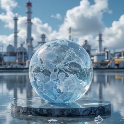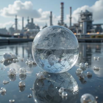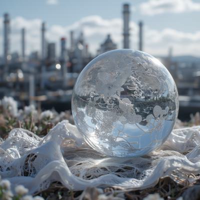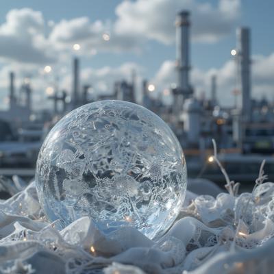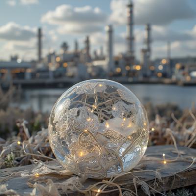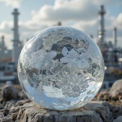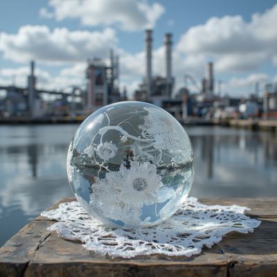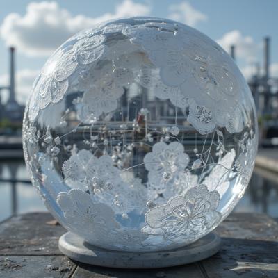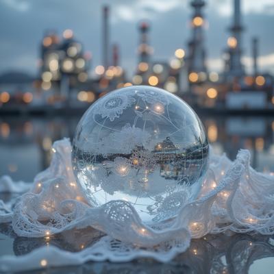 Вдали виднеется нефтеперерабатывающий завод, впереди, на переднем плане: кружево, кружевные узоры, тонкое кружево окутало хрустальный глобус