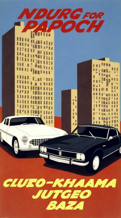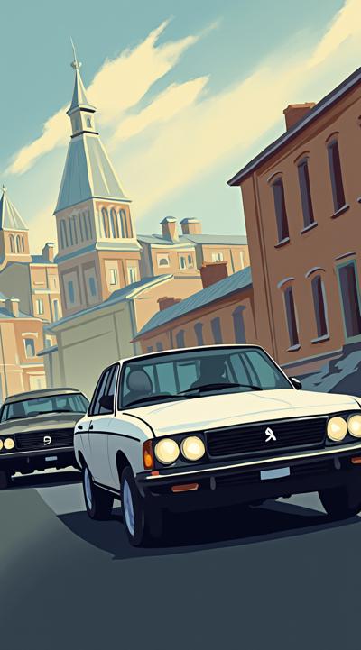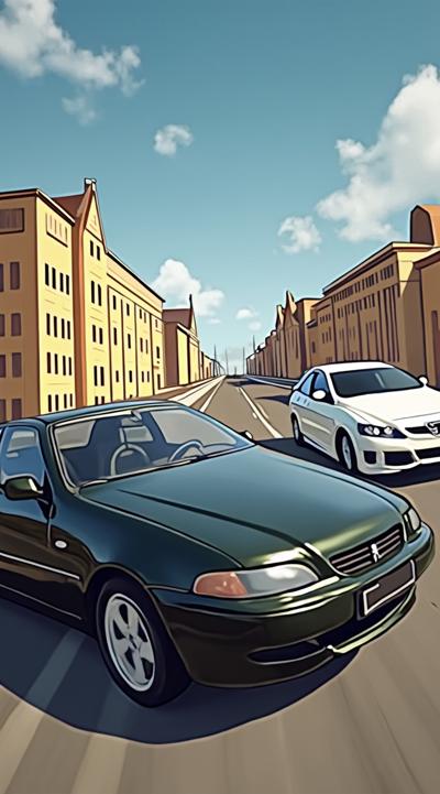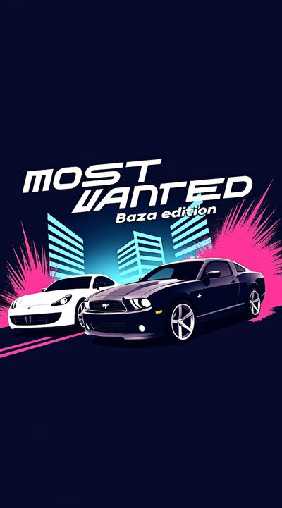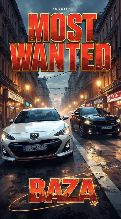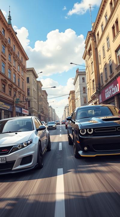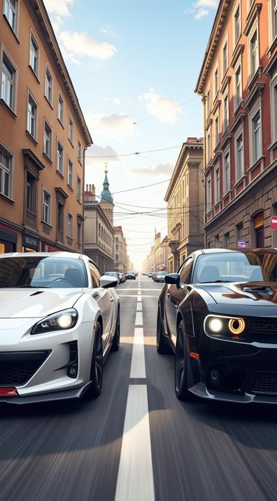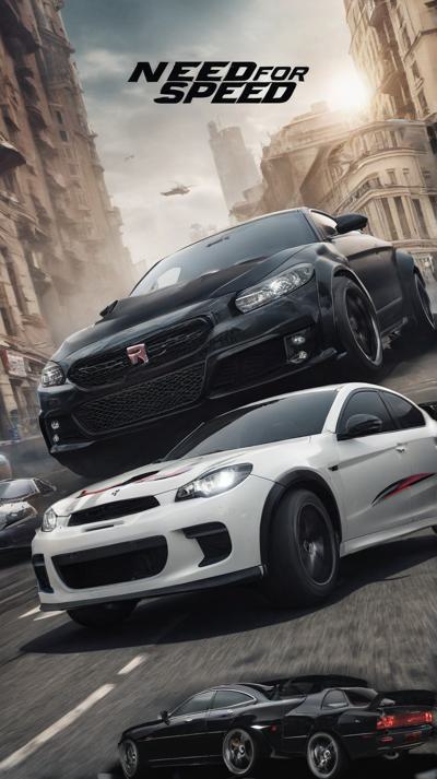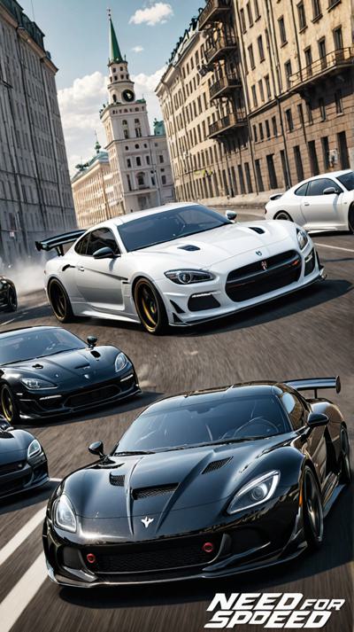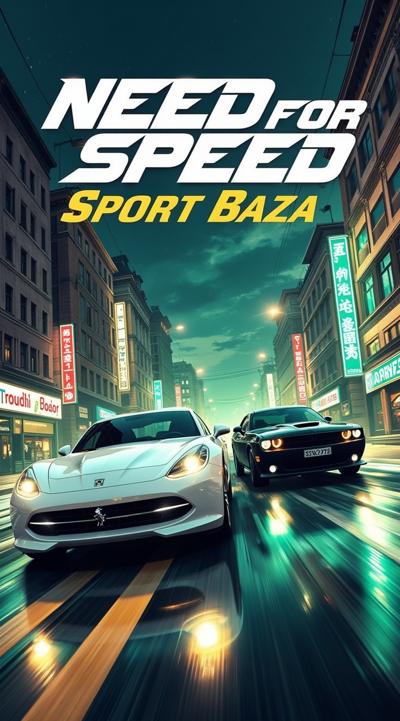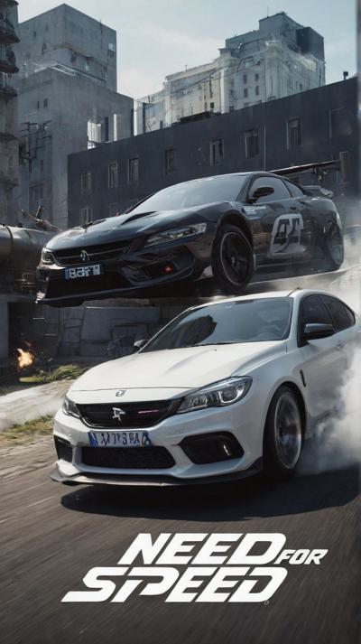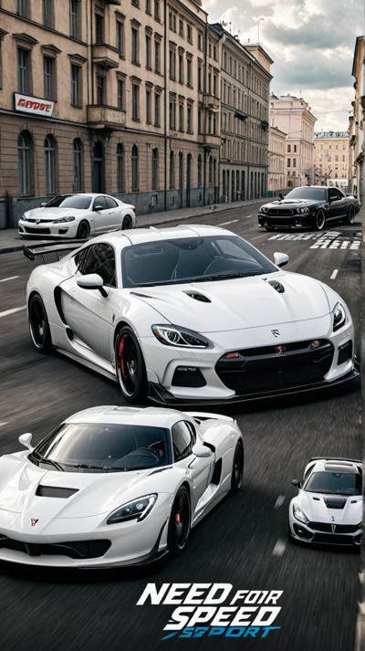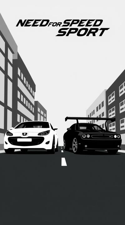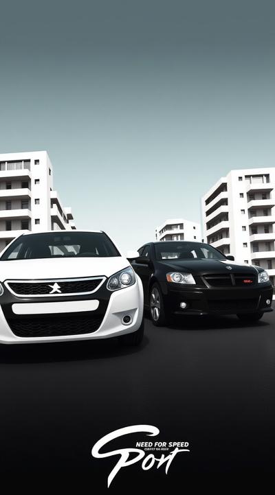 создай обложку новой игры, Need for speed sport baza, на постере две машины белая пежо и черный додж на фоне русских пятиэтажек --ar 9:16
