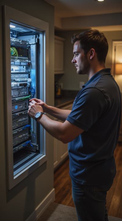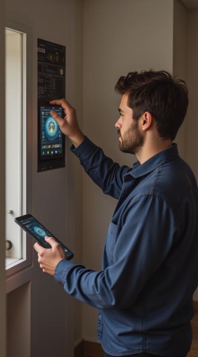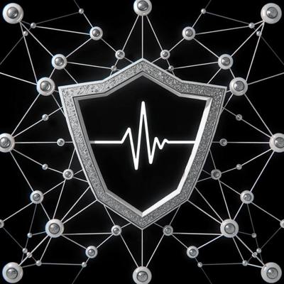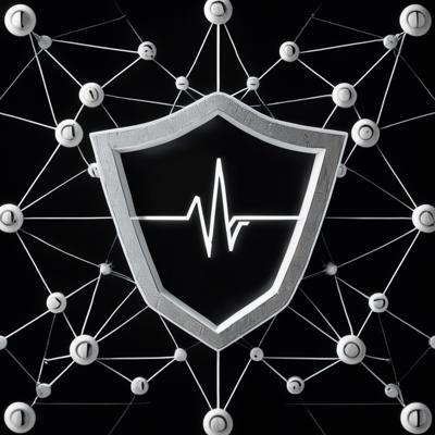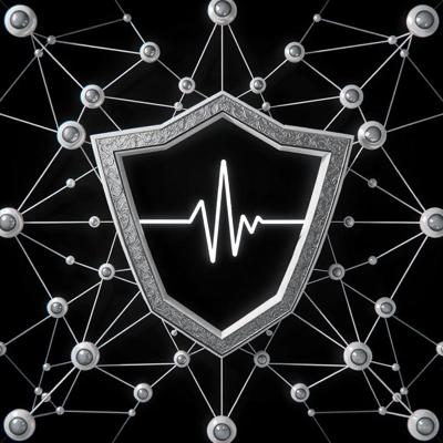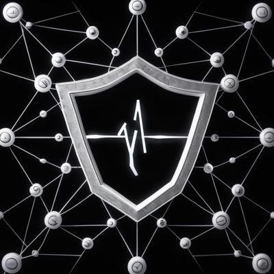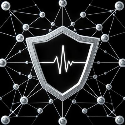 геометрический щит, внутри которого стилизованные «кванты» — небольшие узлы точки, соединённые линиями в виде упорядоченной сетки решётки. В центре — тонкий отметочный элемент (чек пульс), символ решения проблемы. [Вариации (0.7) для #6203851 ]