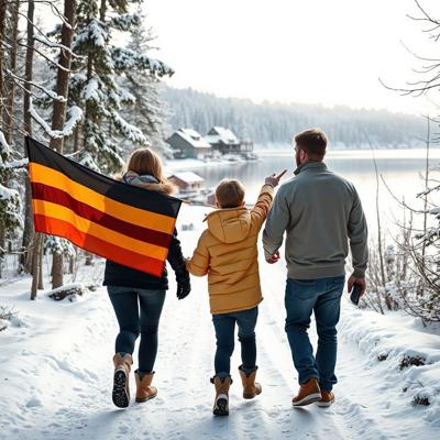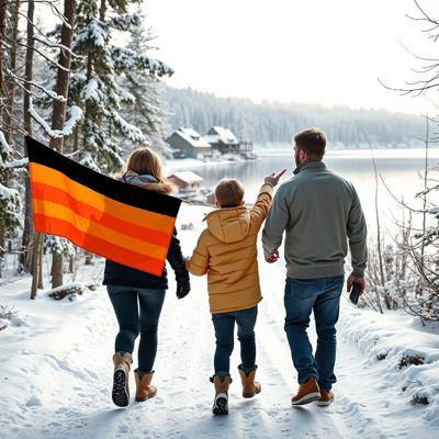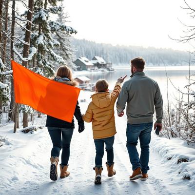 цвета флага только оранжевый и черный [Уточнение для #6201930 'Семья -- мама и папа с двумя детьми -- гуляет по заснеженному лесу. Они смотрят на озеро, на другом берегу озера кафе. Фон белый. Ребенок держит в руках флажок в оранжево-черную горизонтальную полоску (пять чередующихся по цвету полосок). У папы в руке телефон, другой рукой он показывает на озеро. От озера до кафе пунктирная линия -- маршрут. Все происходит в России. Тематика военно-патриотическая. ]'