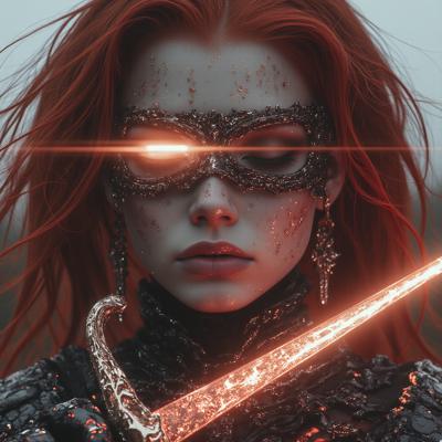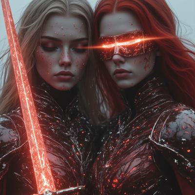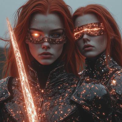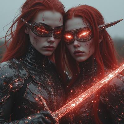 Рыжая девушка с повязкой на левом глазе с мечом рукояти словно лисы, с веснушками на лице. Приобнимает жрицу с сербряными волосами и разом ожограми на лице что давно остались как шрам. Идут средь пустоши пока жрица освещает путь светом из руки. А рыжая защищает ту и ведет за руку.