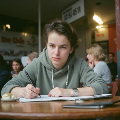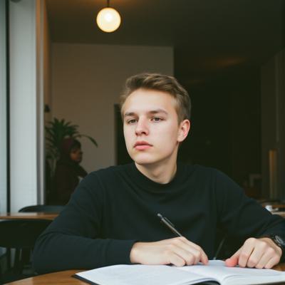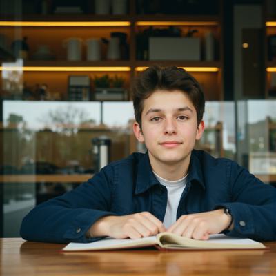 молодой парень студент сидит за столом в кафе,