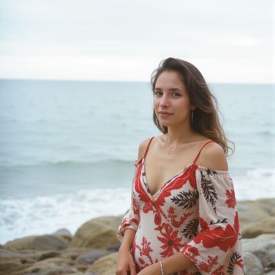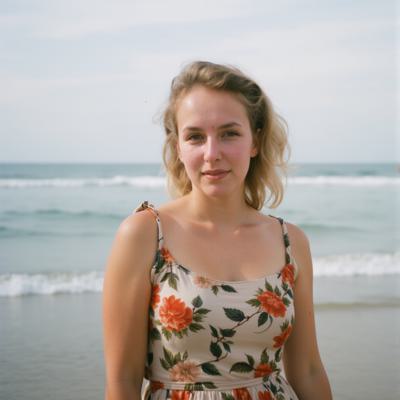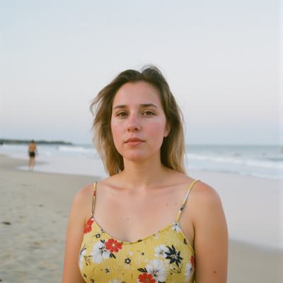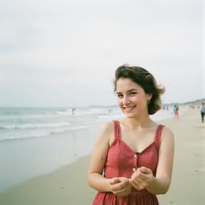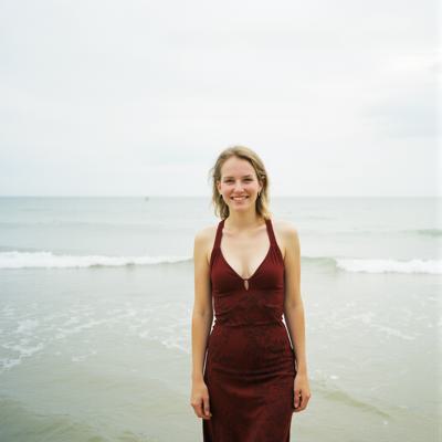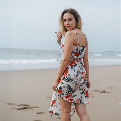 девушка 30 лет в платье, на фоне пляжа,