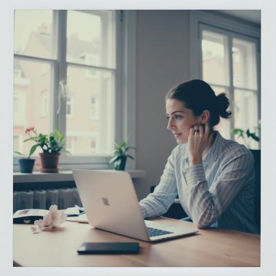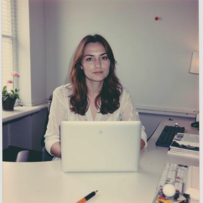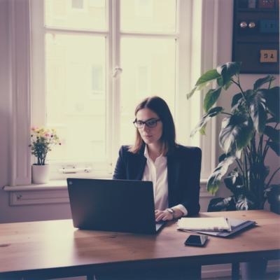 женщина 30 лет сидит в офисе за рабочим столом и ноутбуком