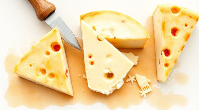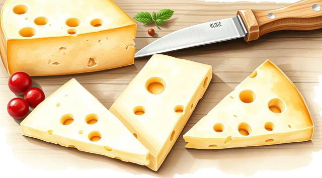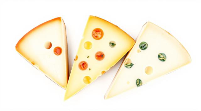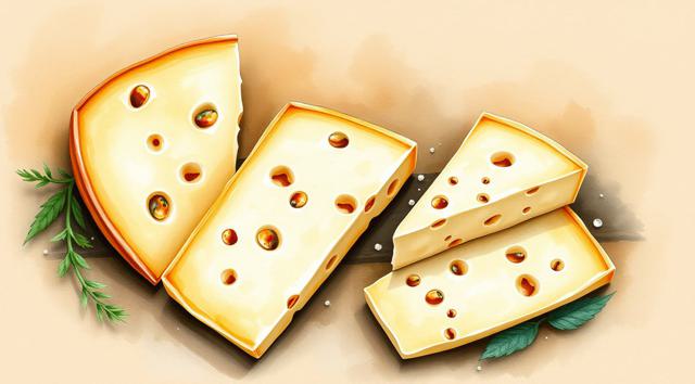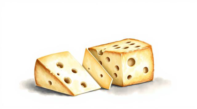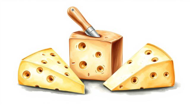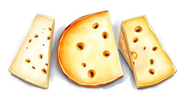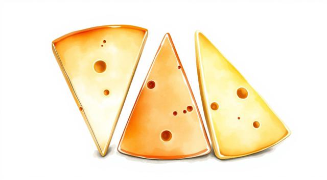 3 кусочка сыра нарезанные треугольниками, качотта с пожитником, сыр деревенский с качотта классическая, в акварельном стиле