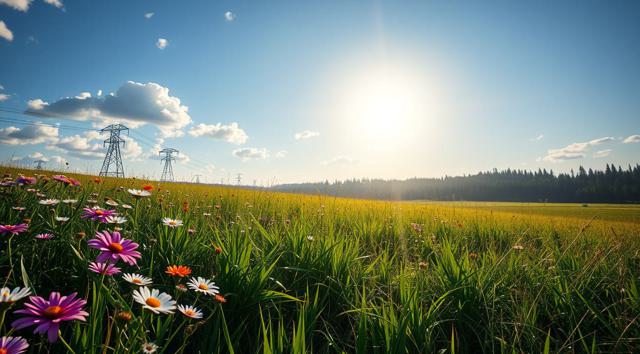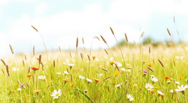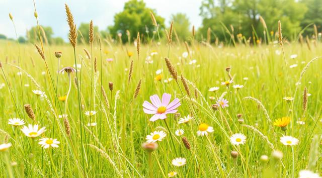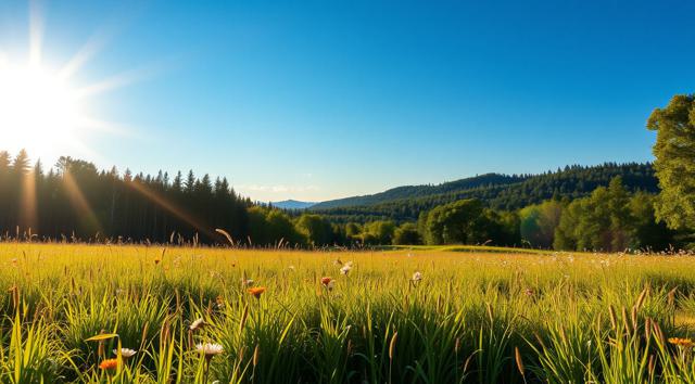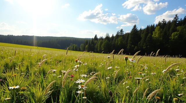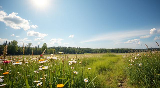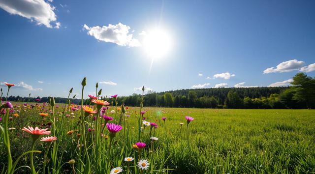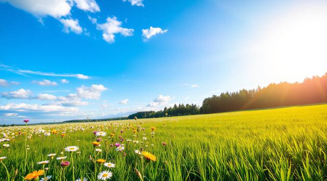 Солнечный летний день, поле в цветах и зеленой траве, далеко вдали виднеется лес