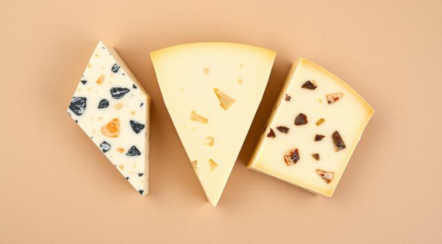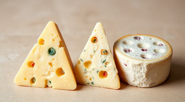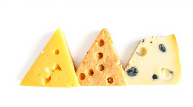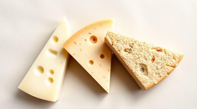 3 кусочка сыра треугольной формы, качотта с пожитником, сыр деревенский с качотта классическая, лежат рядом, в акварельном стиле