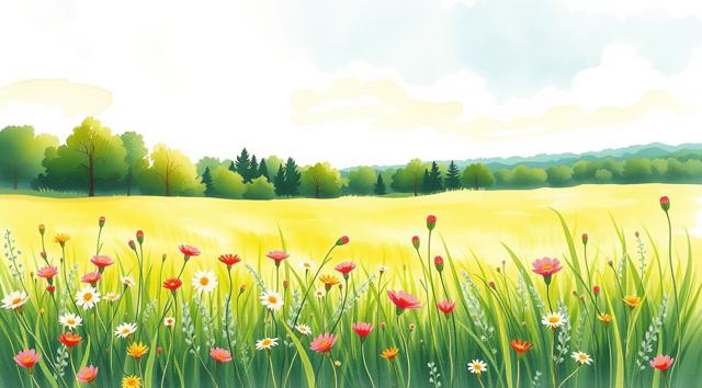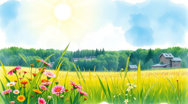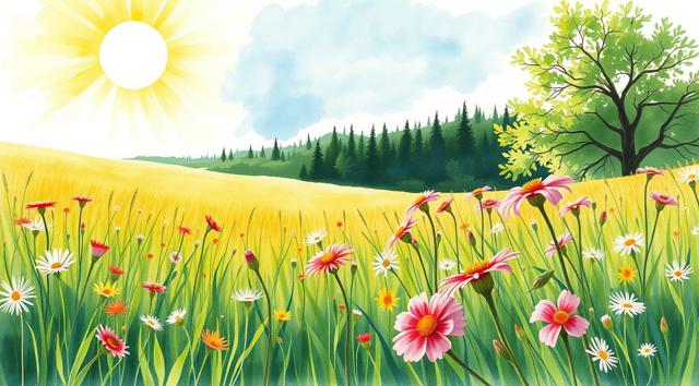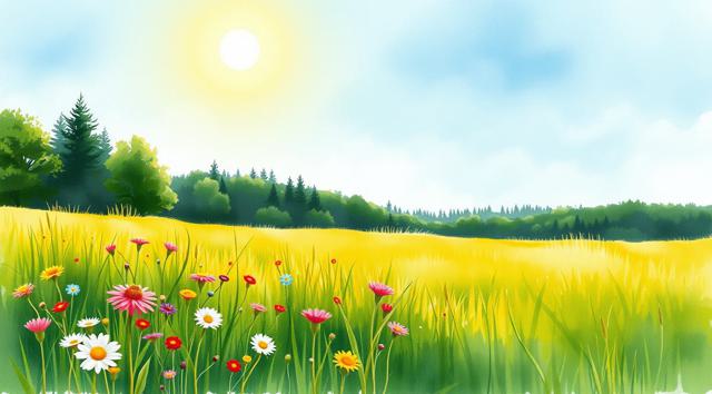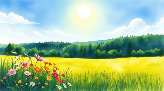 Солнечный летний день, поле в цветах и зеленой траве, далеко вдали виднеется лес, в акварельном стиле, в светлых тонах