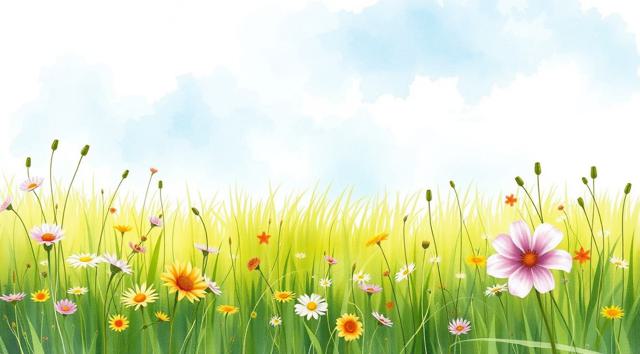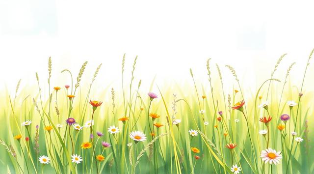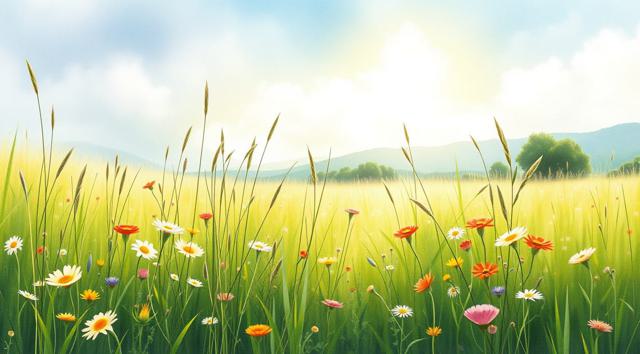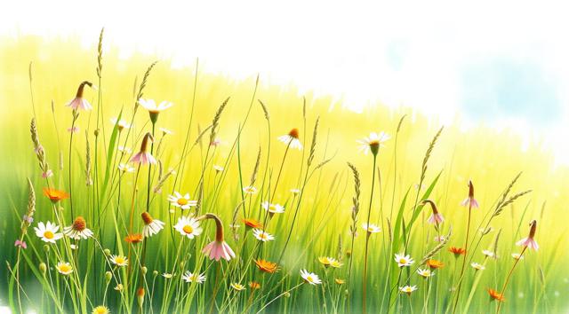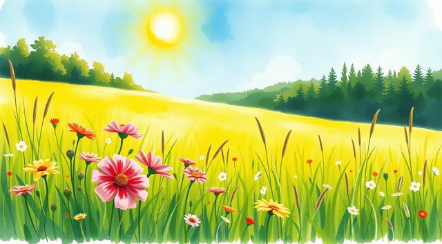 поле луговое в траве и цветах, солнечный летний день, в акварельном стиле