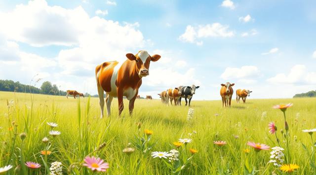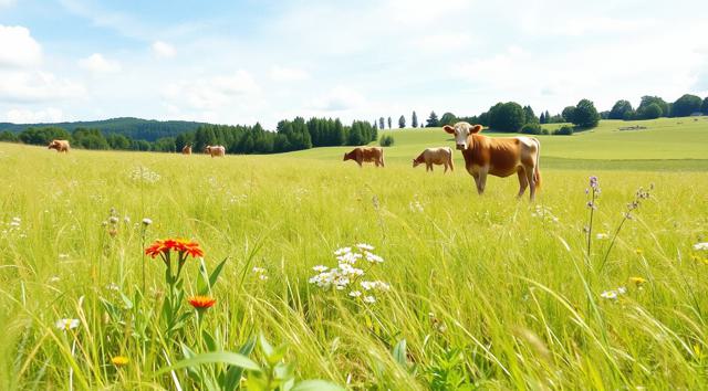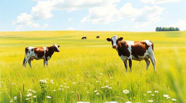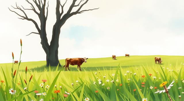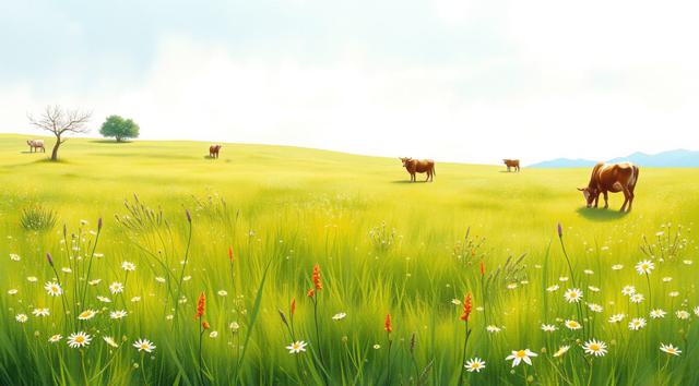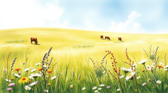 поле луговое в траве и цветах, солнечный летний день, далеко пасутся коровы, в акварельном стиле