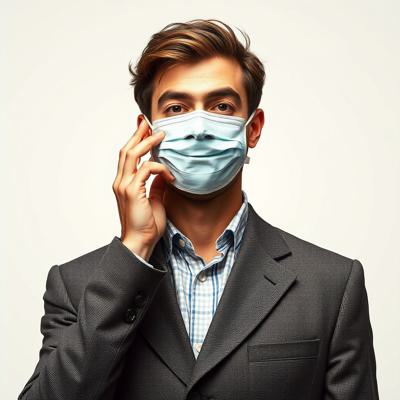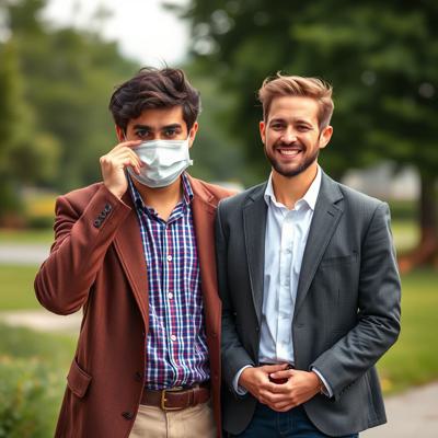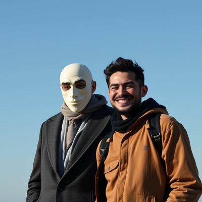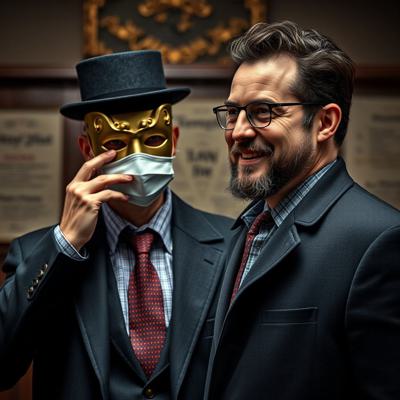 Человек, примеряюший маску, лицемер, напротив него стоит счастливый добрый честный человек