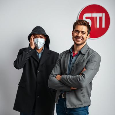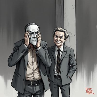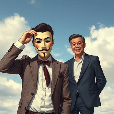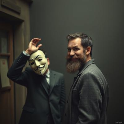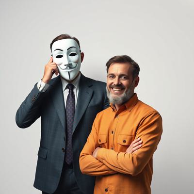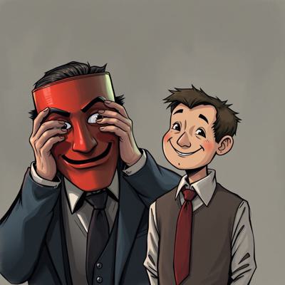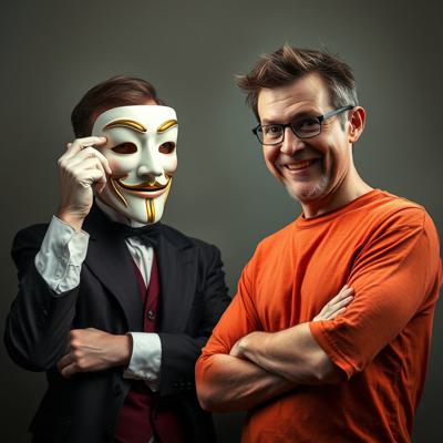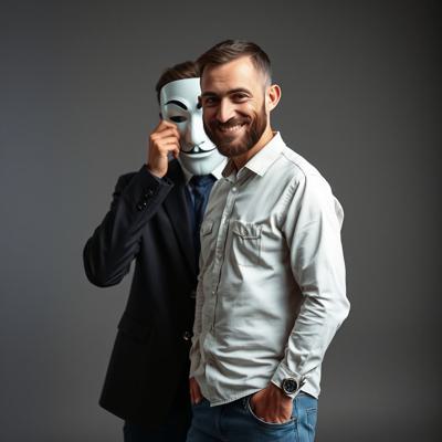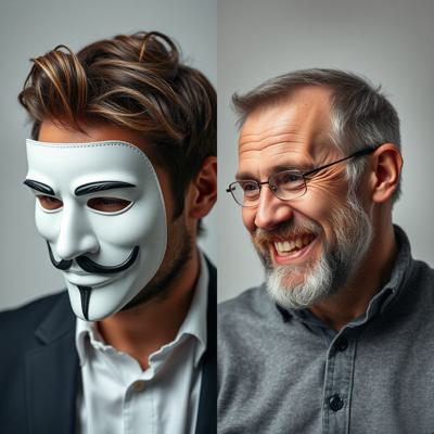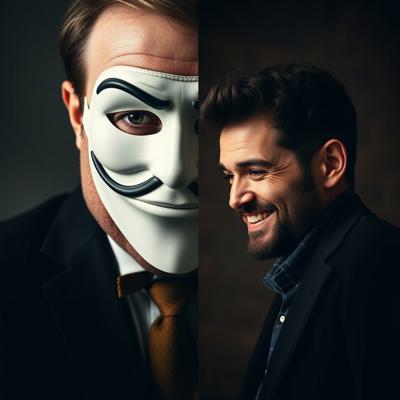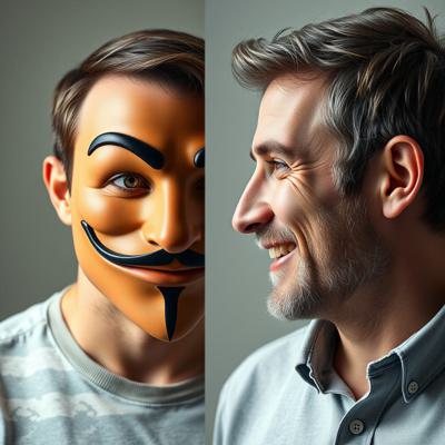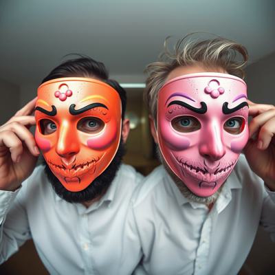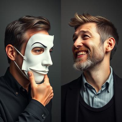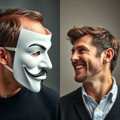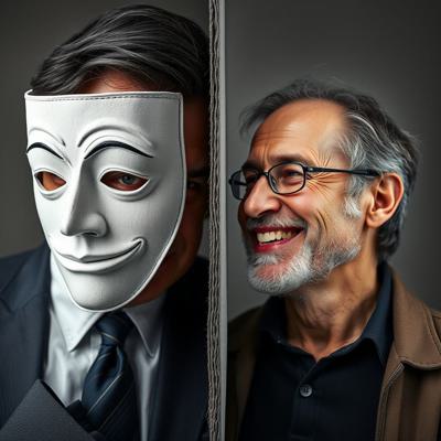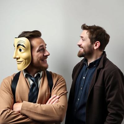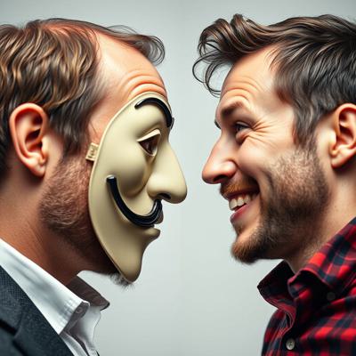 Человек, примеряюший маски, лицемер, напротив него стоит счастливый честный человек