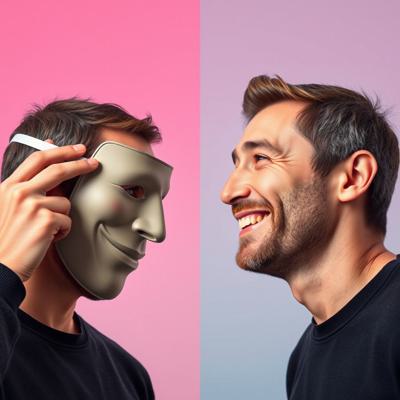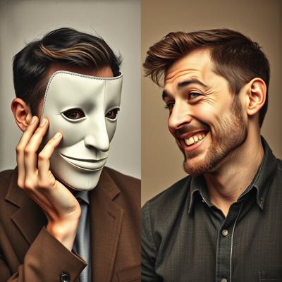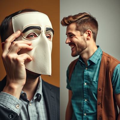 Половина картинки человек, примеряюший маску, страдающий от лицемерия, на второй половине картинки счастливый добрый честный человек, они смотрят друг на друга, вся картинка объелинена в один сюжет
