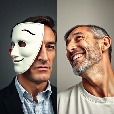 Половина картинки человек, примеряюший маску, страдающий от лицемерия, на второй половине картинки счастливый добрый честный человек, они смотрят друг на друга