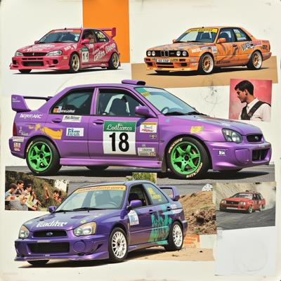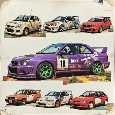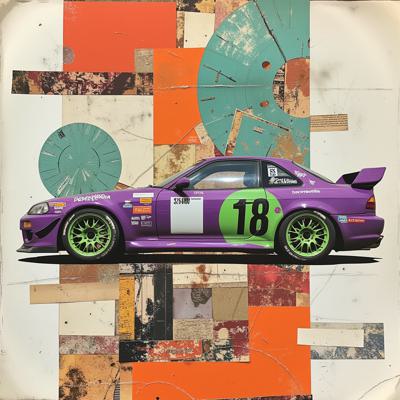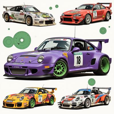 Фиолетовая машина с зелёными дисками с числом 18 на кузове. Много разных вариаций автомобиля от дрифта до ралли