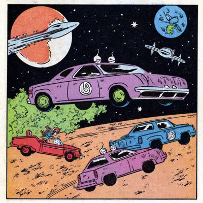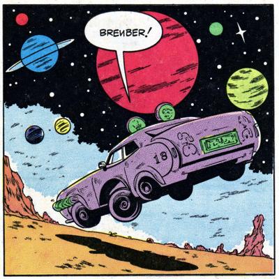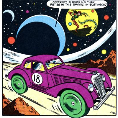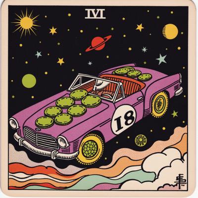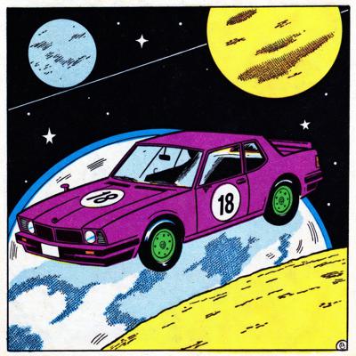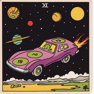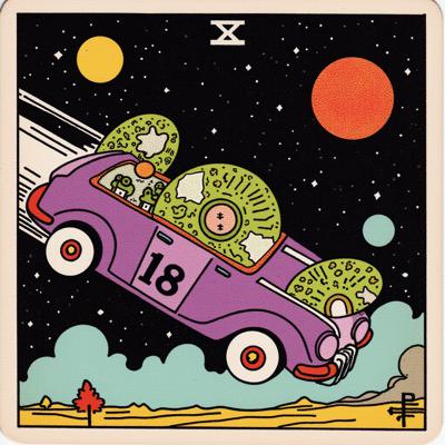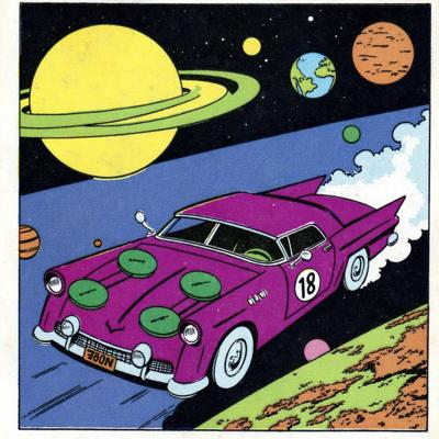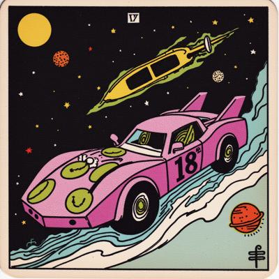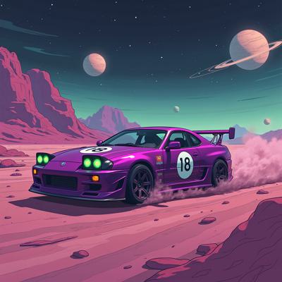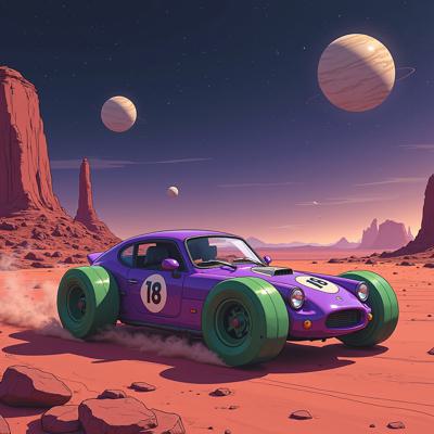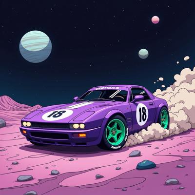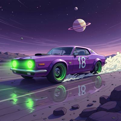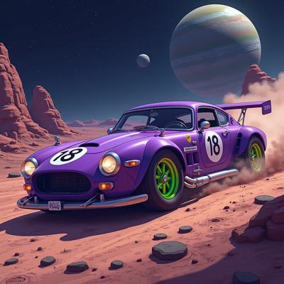 Фиолетовая машина с зелёными дисками с числом 18 на кузове., которая дрейфует в космосе и на разных планетах