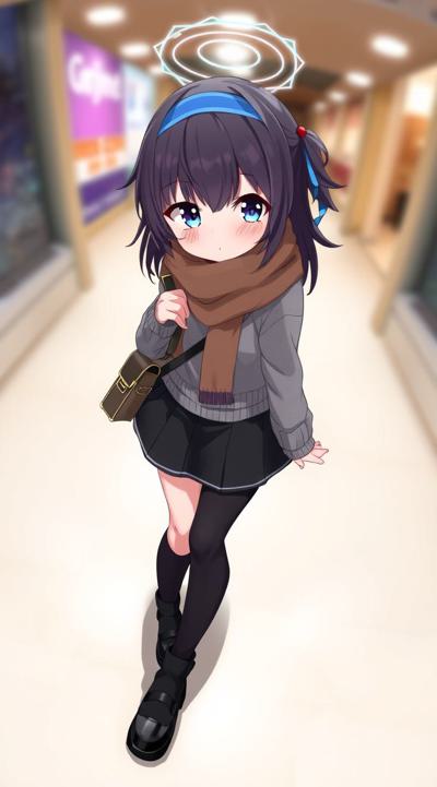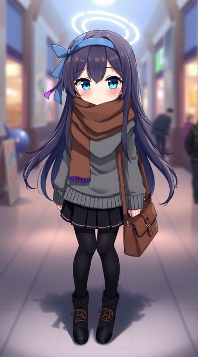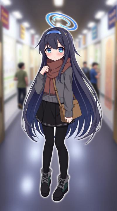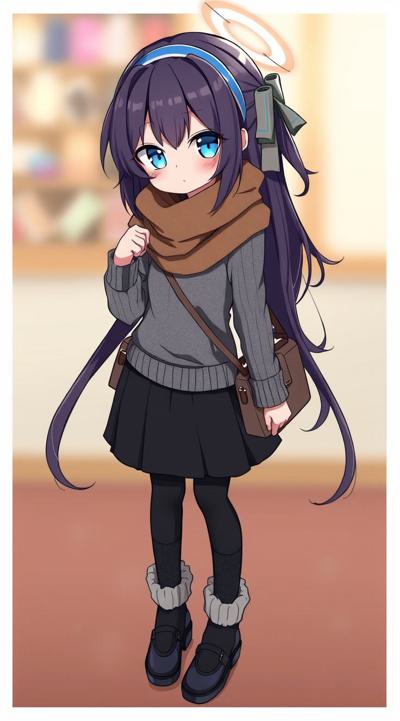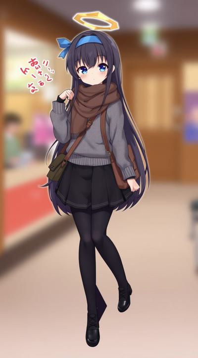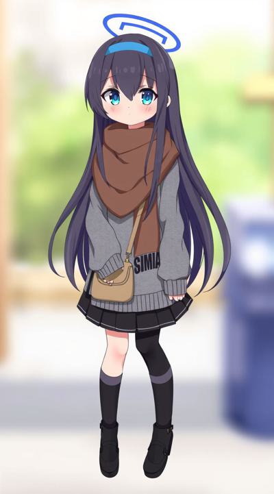 1girl, alternate costume, bag, bags under eyes, black footwear, black hair, black pantyhose, black skirt, blue eyes, blue hairband, blurry background, blush, brown scarf, closed mouth, full body, grey sweater, hair between eyes, hairband, halo, leg warmers, long hair, long sleeves, looking at viewer, loose socks, outdoors, pantyhose, plaid, plaid scarf, purple hairband, scarf, skirt, sleeves past wrists, socks, solo, sweater, ui \(blue archive\)