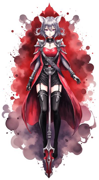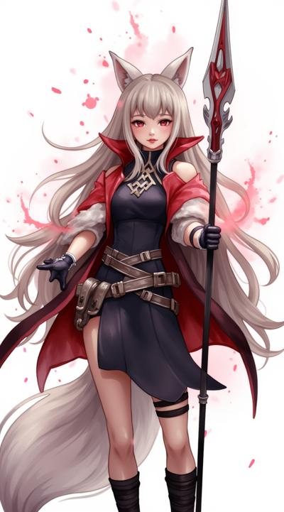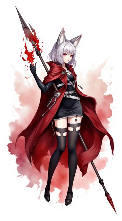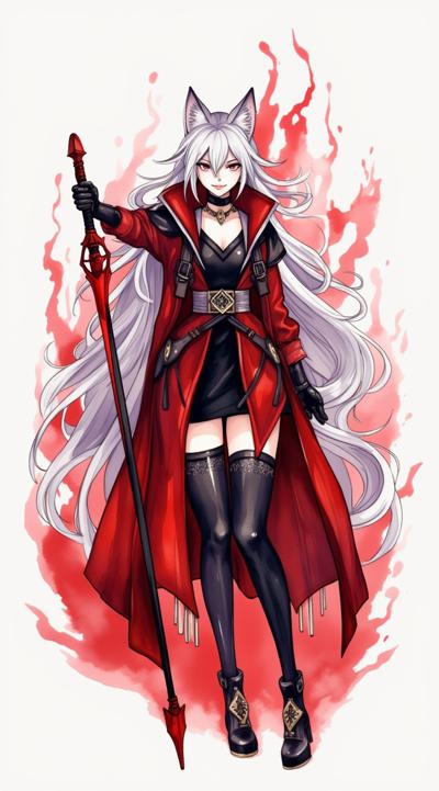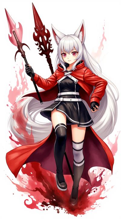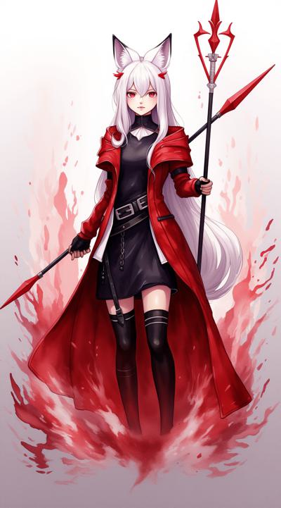 1girl, angelina \(distinguished visitor\) \(arknights\), fox ears, black dress, white belts, red coat, gloves, black thighhighs, fox silhouette from behind, smoky fox, red and white silhouette, holding a futuristic spear, aiming the spear, striking, red flashes from the spear, epic pose, view from below, looming over the viewer, leg raised in a strike, destroyed metropolis in the background, red stop sign,(watanabe tomari:1.2), (kagoya1219:0.5), (genyaku:0.4), (senju yosiyuki:0.7), (umikochannart:0.3), (huangdanlan:1.2), (akasia:1.4), (oyu_udon:1.5),sparkles,masterpiece,high quality,(huge detailed:1.8),8k, (huge detailed:1.8),limited palette, bokeh, (film grain)