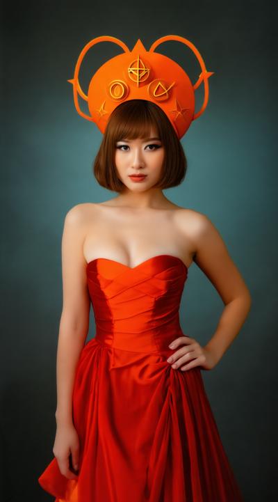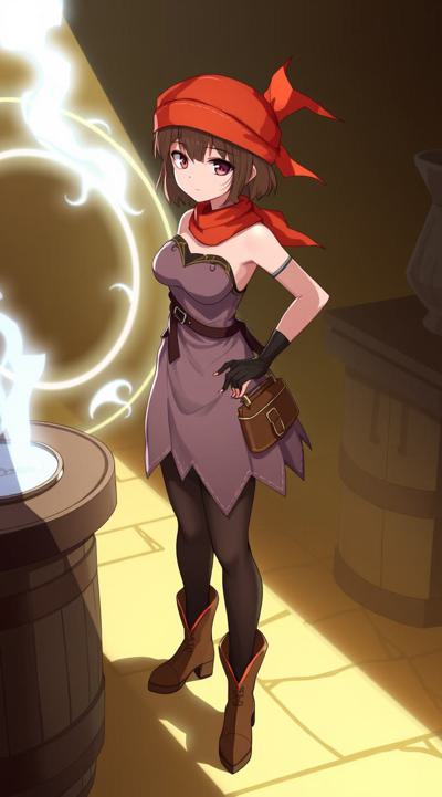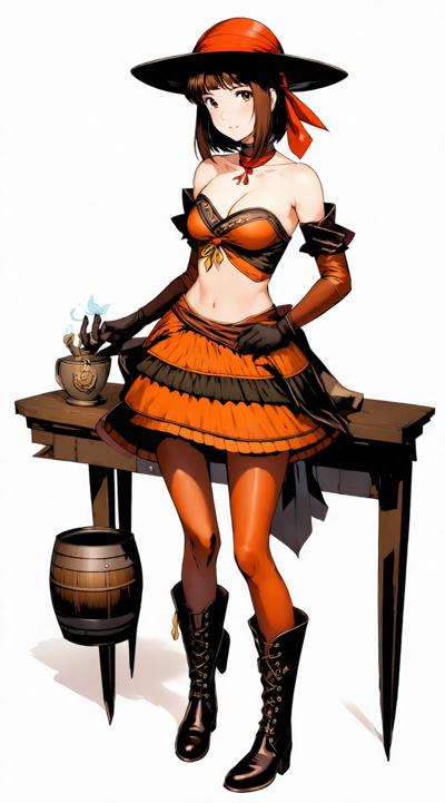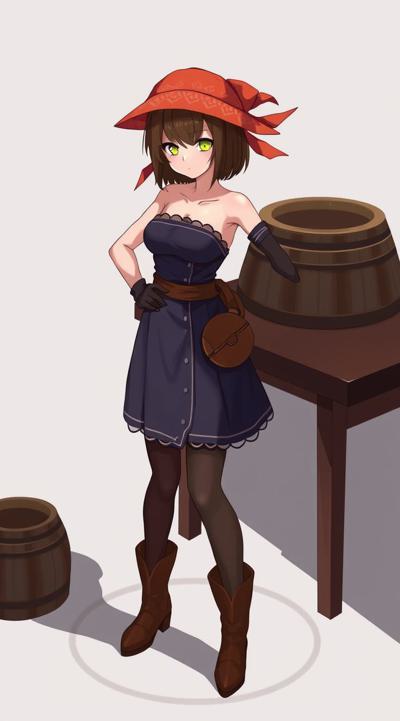 1girl, bandana, bare shoulders, barrel, boots, breasts, brown hair, cleavage, dress, fantasy, gloves, hand on own hip, hat, looking at viewer, magic circle, orange headwear, pantyhose, pouch, red headwear, shadow, short hair, skirt, solo focus, standing, strapless, strapless dress, table, thighhighs, white gloves, wooden floor, wooden table