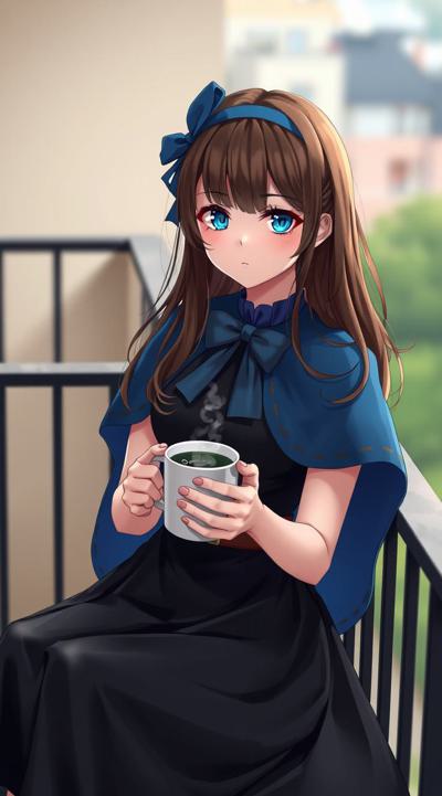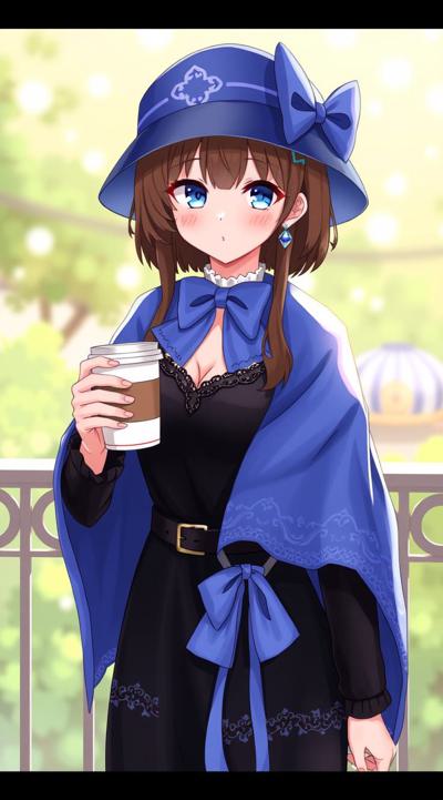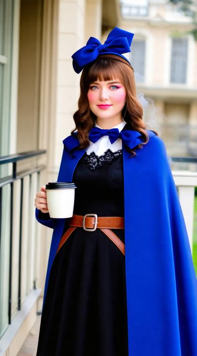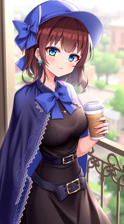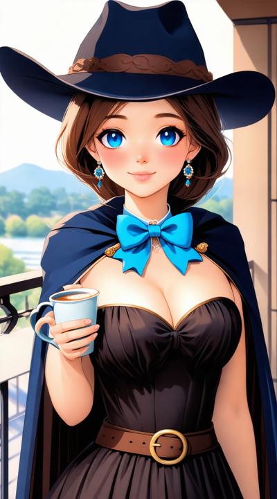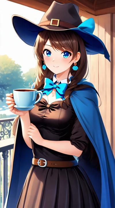 1girl, balcony, belt, black dress, blue bow, blue bowtie, blue cape, blue eyes, blue headwear, blurry background, blush, bow, bowtie, breasts, brown belt, brown hair, cape, cleavage, cloak, coffee, coffee mug, cowboy shot, cup, dress, earrings, hat, hat bow, holding, holding cup, jewelry, lace trim, lace-trimmed dress, large breasts, lips, long hair, long sleeves, looking at viewer, medium breasts, mug, outdoors, parted lips, railing, smile, solo, standing, star earrings, steam, two-sided cape, two-sided fabric, wavy hair, witch, witch hat