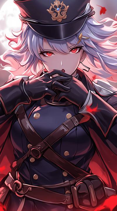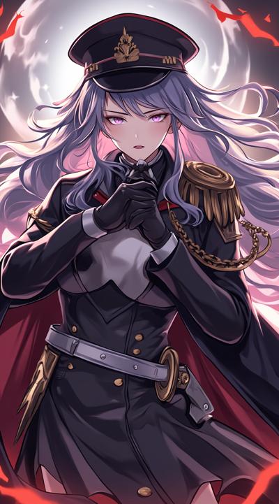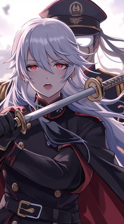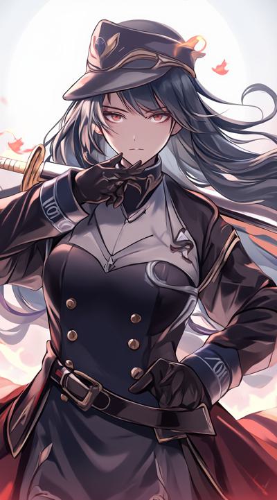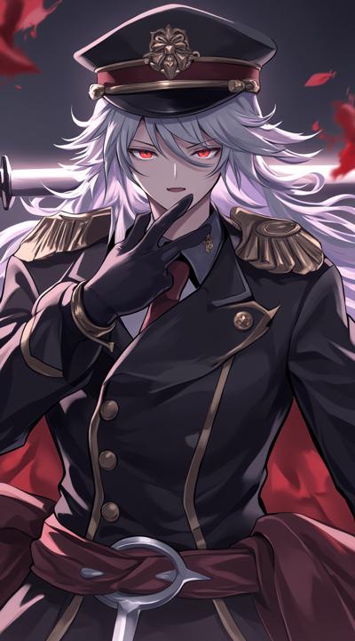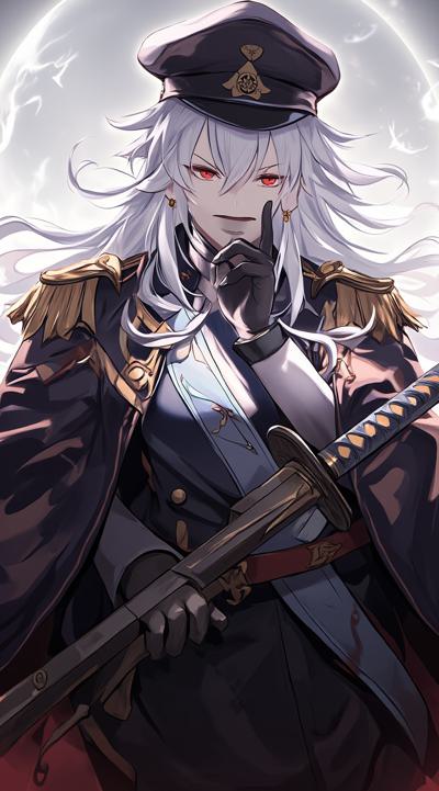 1girl, belt, black gloves, black hair, breasts, coat, epaulettes, faceless, faceless male, gloves, grey hair, hair between eyes, hand on own chin, hat, jacket, large breasts, long hair, military, military hat, military uniform, open mouth, peaked cap, skirt, sword, uniform, weapon, white hair