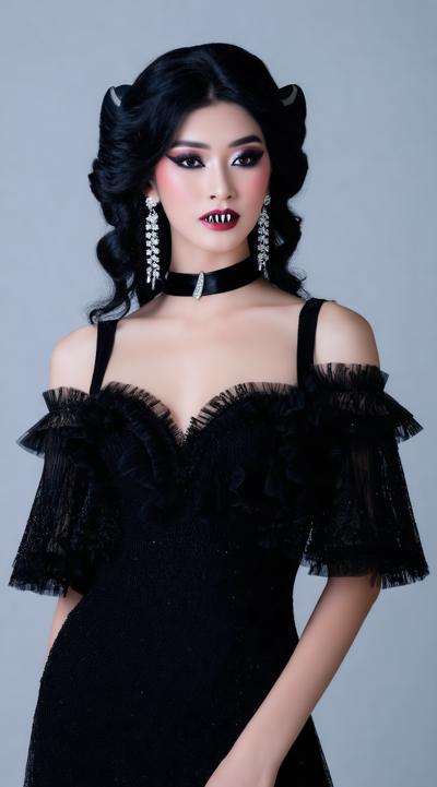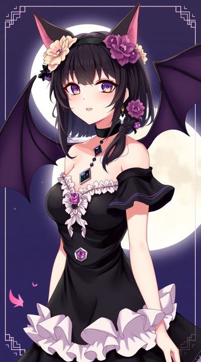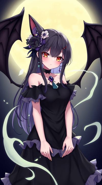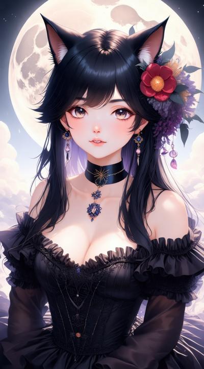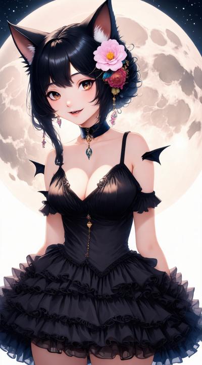 1girl, animal, animal ear fluff, animal ears, asymmetrical sleeves, bare shoulders, bat \(animal\), black choker, black dress, black hair, breasts, cat ears, choker, cleavage, dress, earrings, fangs, flower, frilled dress, frills, full moon, hair flower, hair ornament, hairband, huge moon, jewelry, lips, lipstick, long hair, looking at viewer, makeup, medium breasts, moon, moonlight, necklace, night, night sky, off shoulder, off-shoulder dress, outdoors, parted lips, red eyes, red flower, red lips, red rose, rose, sky, solo, sparkle, upper body, vampire