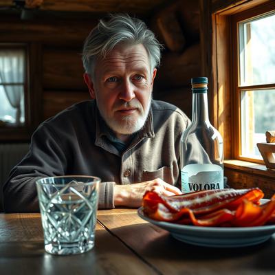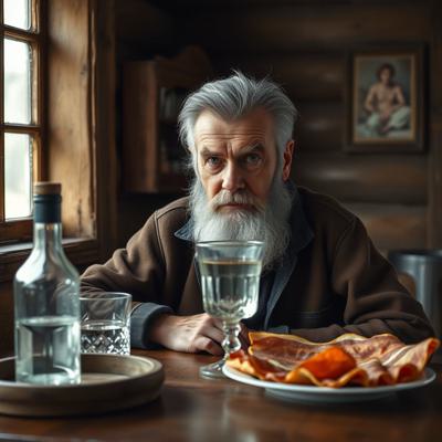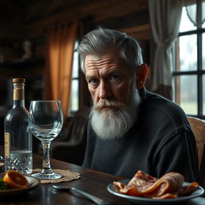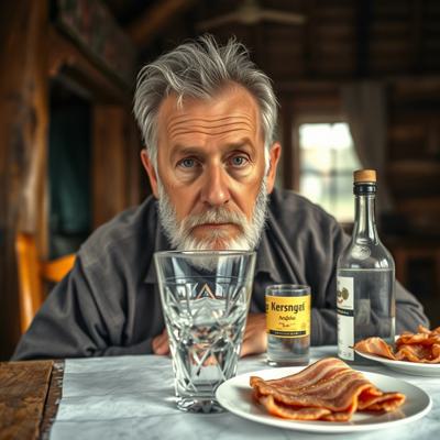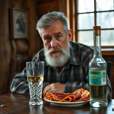 сгенерируй картинку: зрелый седовласый поляк с щетиной лет пятидесяти и с морщинами и со стеклянным правым глазом сидит за столом в деревянном деревенском доме, на столе гранёный стакан и бутылка водки, рядом стоит тарелка с салом,