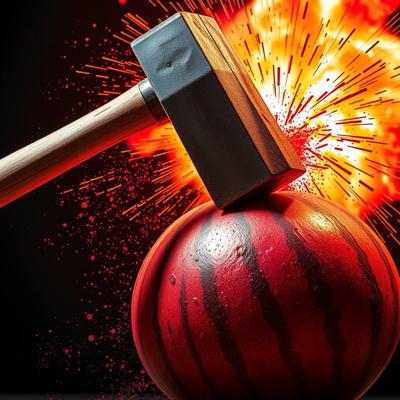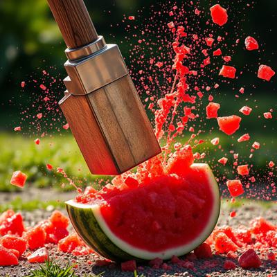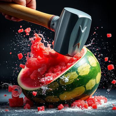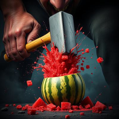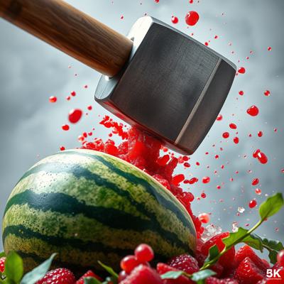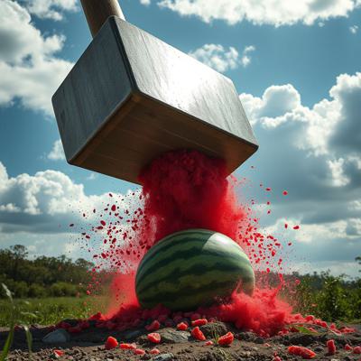 Огромная кувалда со всей силы разносит арбуз, из которого расплескается в разные стороны его красная мякоть