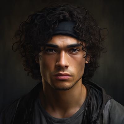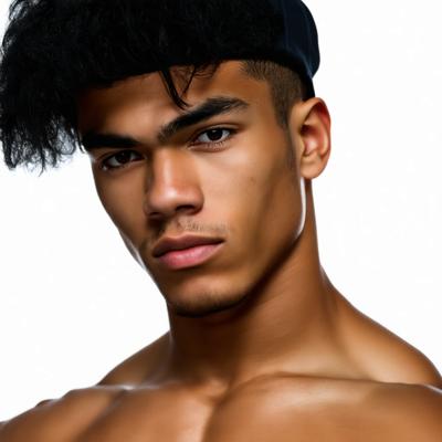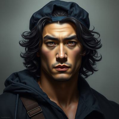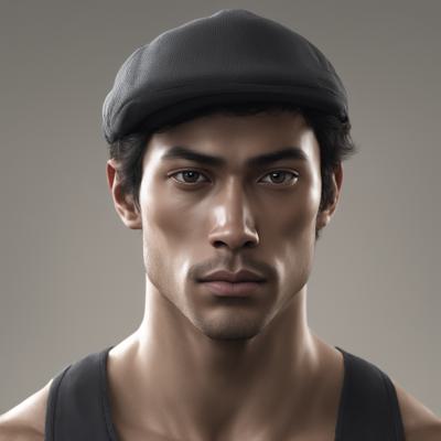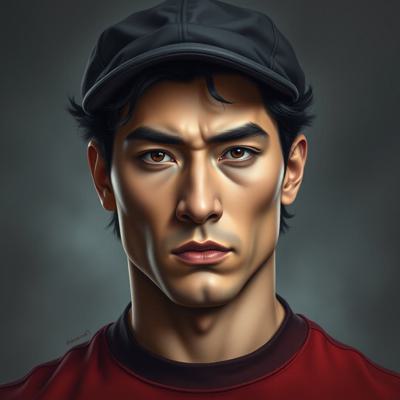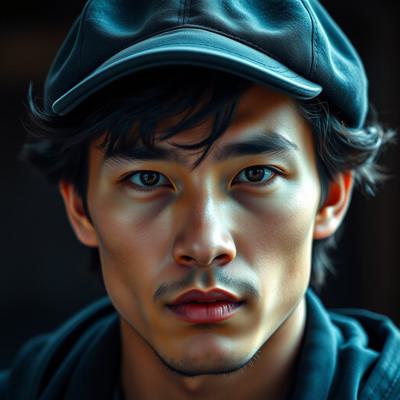 A photorealistic portrait of a young mixed-race (Japanese and European (English and Italian)) man. He is very tall and muscular, with a strong jaw, intense eyes, and thick dark wavy hair under a dark cap. He looks serious and imposing