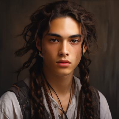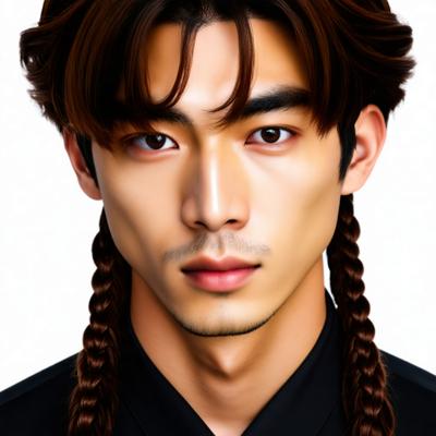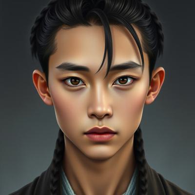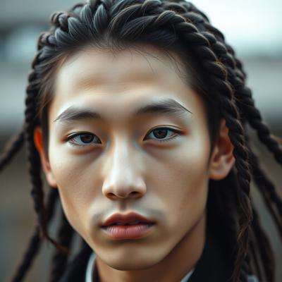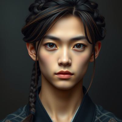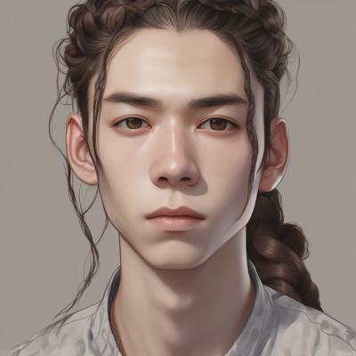A photorealistic portrait of a beautiful young man with androgynous mixed-race (Japanese and English) features. He has a delicate face, large expressive eyes, and dark chestnut hair styled in an intricate way with small braids. He looks serene and determined