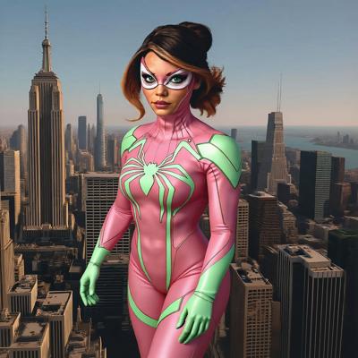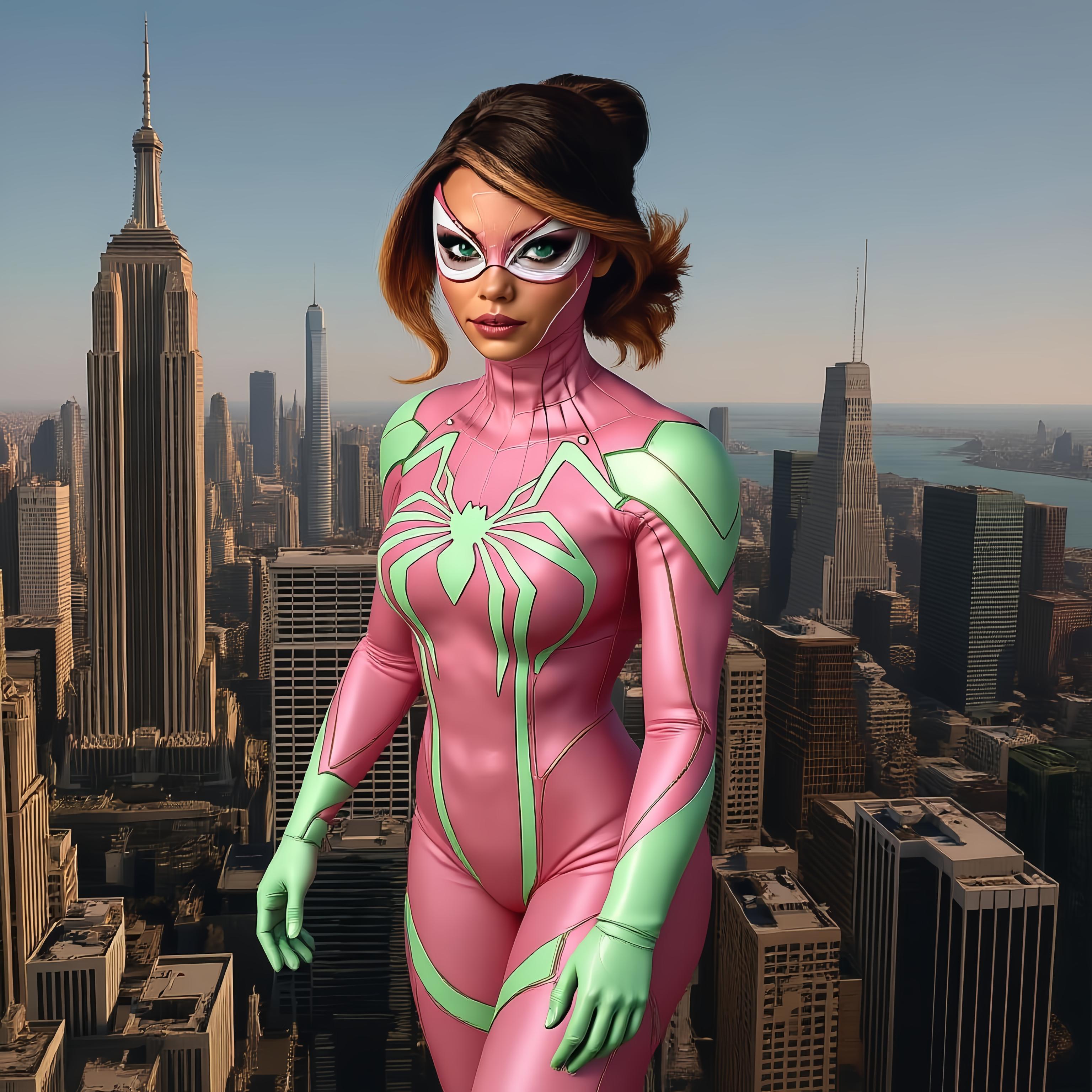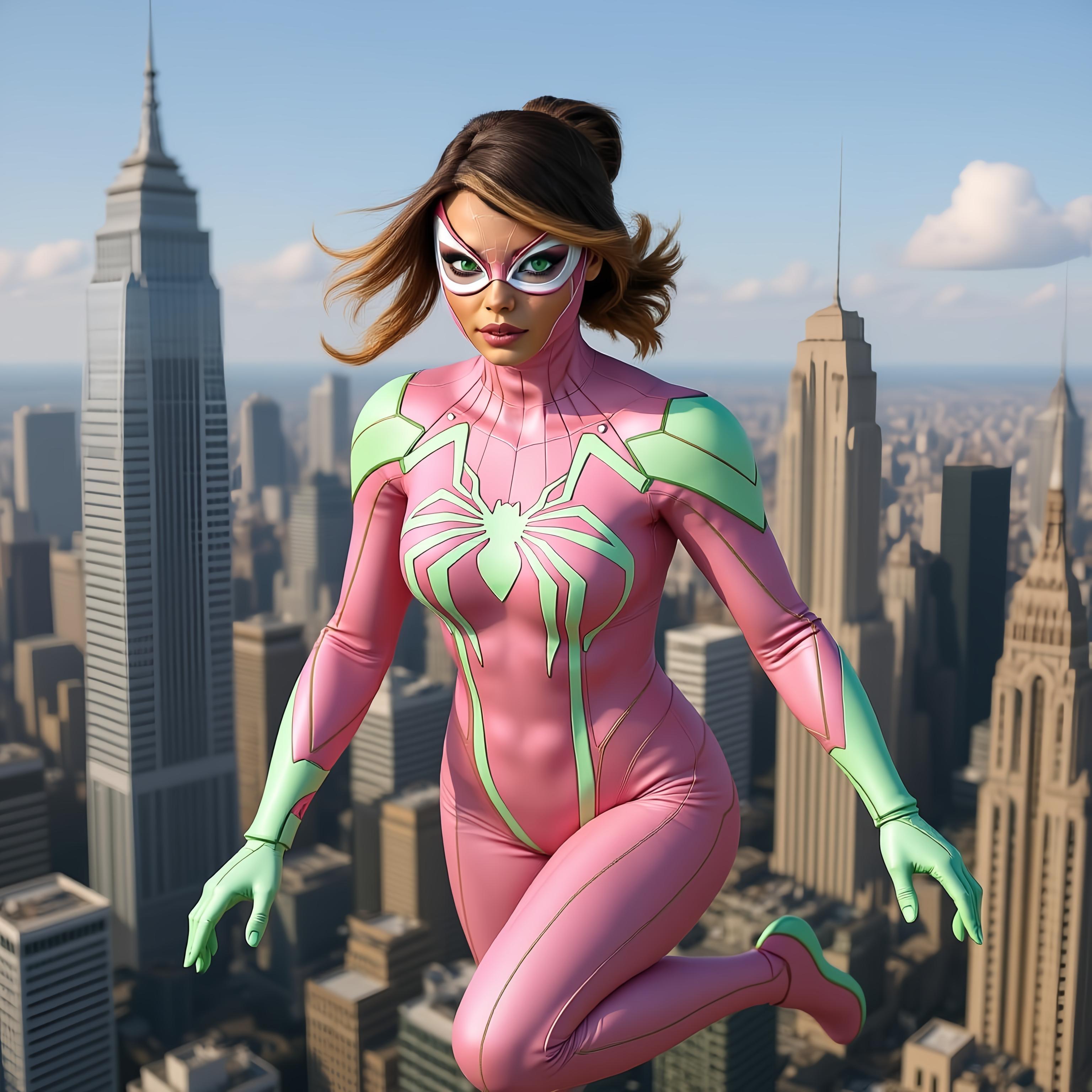 На фоне небоскрëбов летит [Качество x3 [Уточнение (0.5) для #6219232 'сделать глаза менее яркими [Уточнение для #6219225 'Глаза светло-зелëного цвета, неяркие [Уточнение (0.1) для #6219218 'Все волосы шатенистые, но две передние пряди волос русые. [Уточнение (0.5) для #6219192 'Spiderwoman в нежно-розовом костюме со светло-зелëными элементами. Шатенка, пуэрториканка. Marvel. ]']']']']