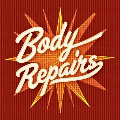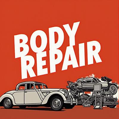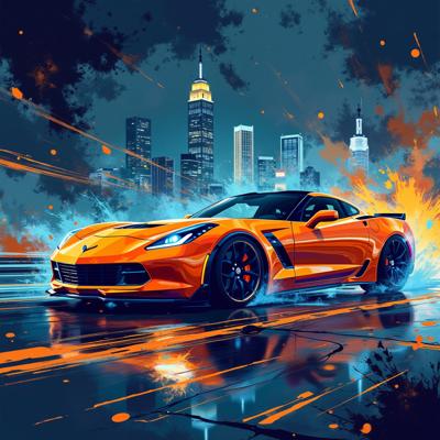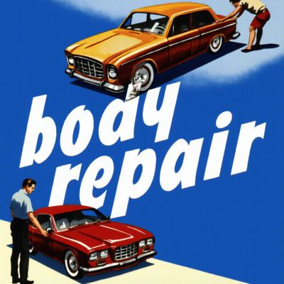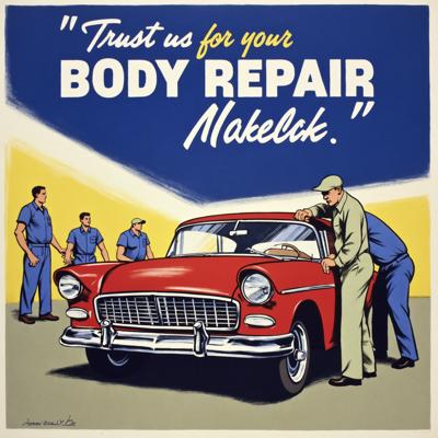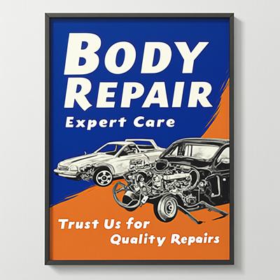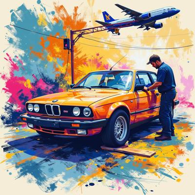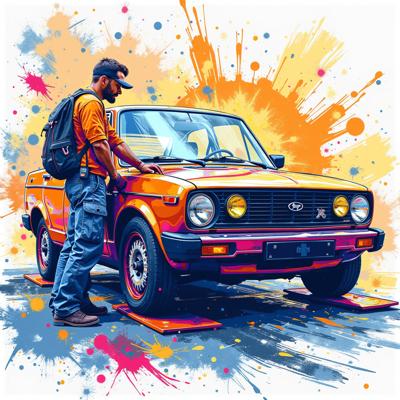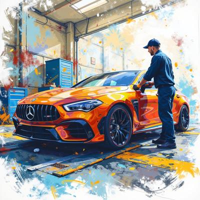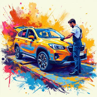 Рисунок в стиле граффити на котором мастер кузовного ремонта устанавливает автомобиль на автомобильный стапель