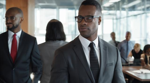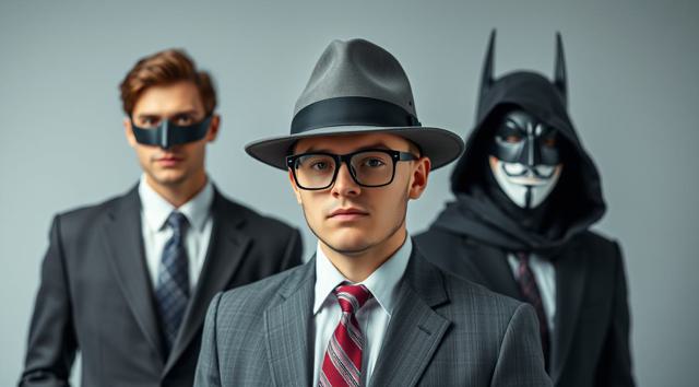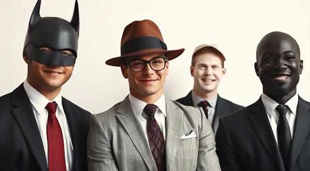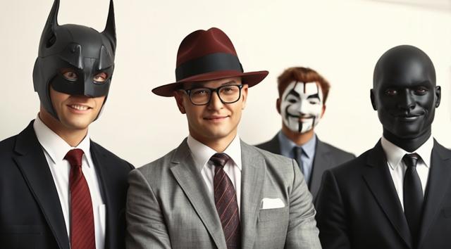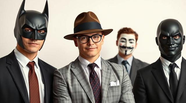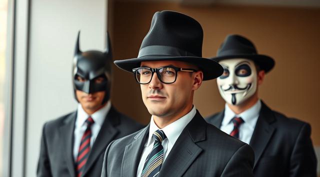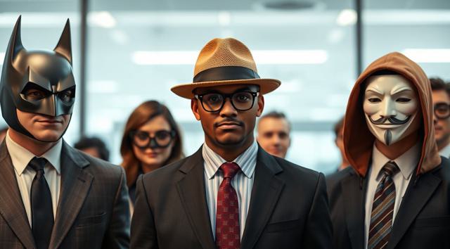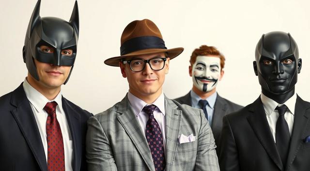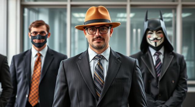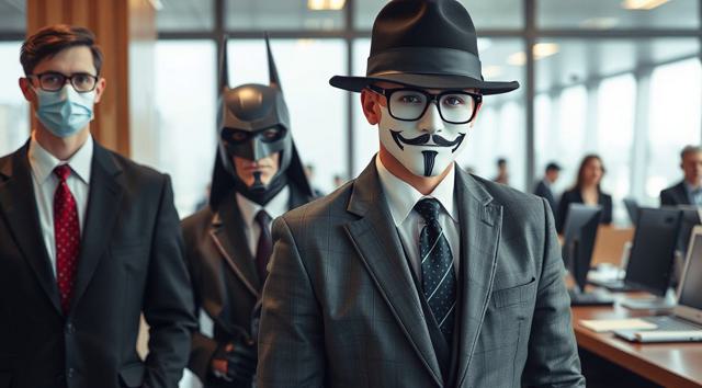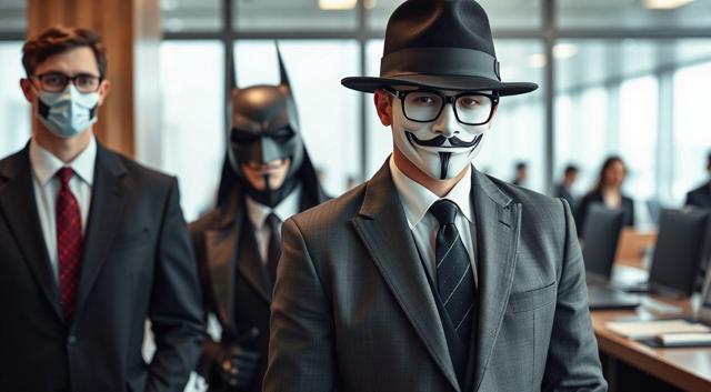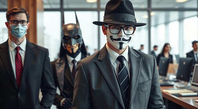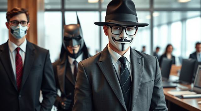шапка для страницы группы, стиль офиса преобладает, дополняют стили бетмена и анонимуса, галстук, костюм и очки, [Вариации (0.9) для #5970861 ]