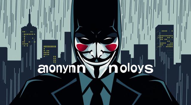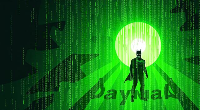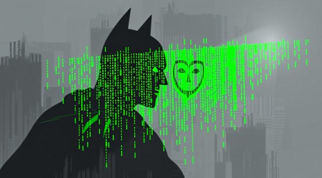 абстрактная цифровая живопись, 21:9, яркие цвета, серый и зеленый, силуэты Бэтмена и Анонимуса в стиле цифрового глитча, каскадный зеленый код Матрицы, текст Анонимный работник , излучающий позитивную энергию и хакерскую эстетику, высокое разрешение, артхаус