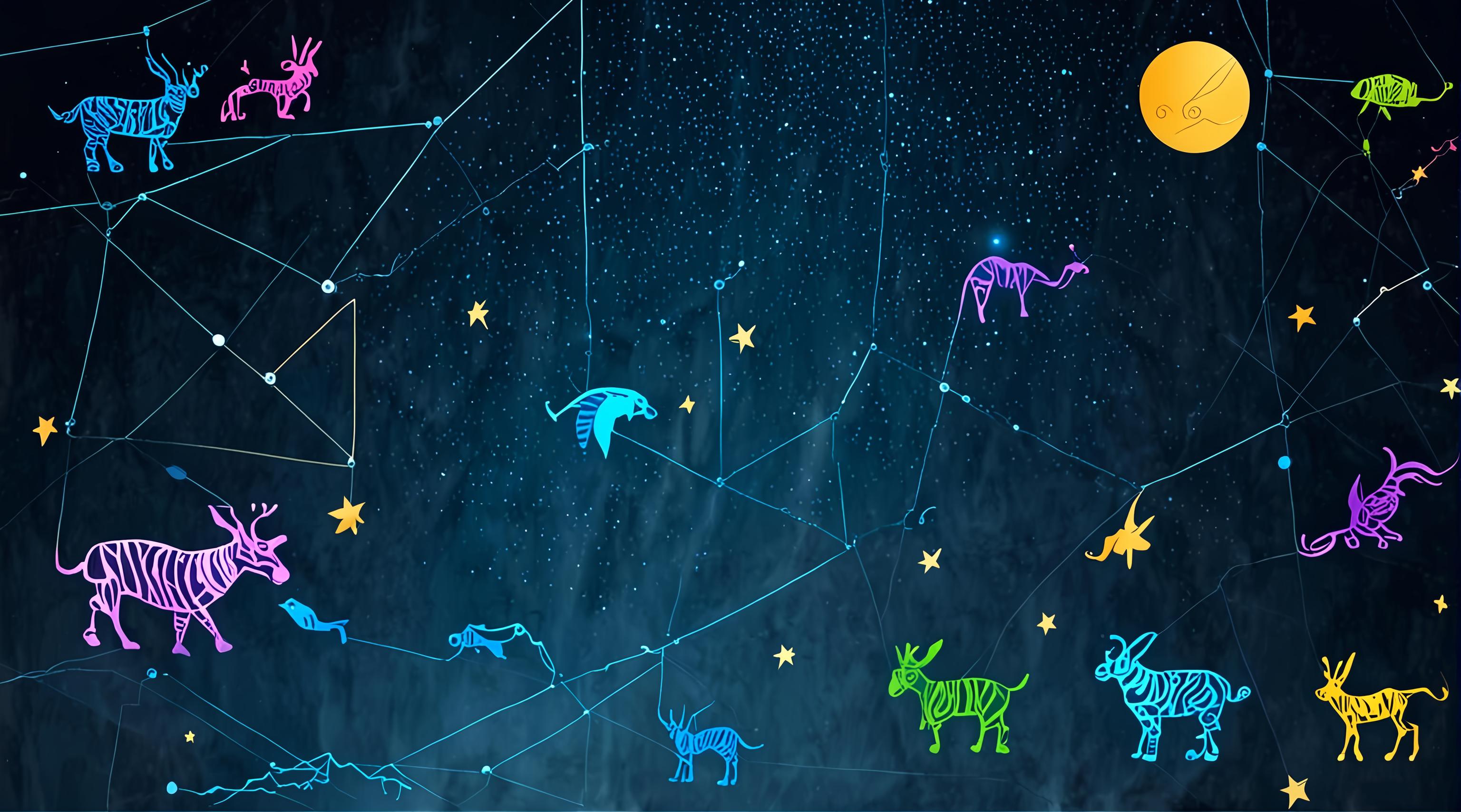 нарисуй красочные созвездия на небе изобразив в том числе животных из этих созвездий [Качество x3 [Детализация для #5981530 ]]