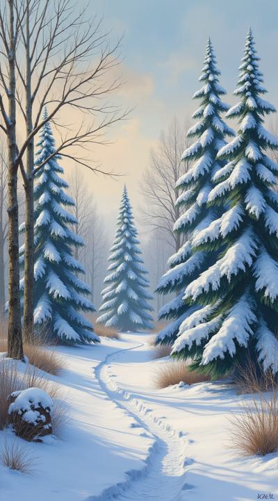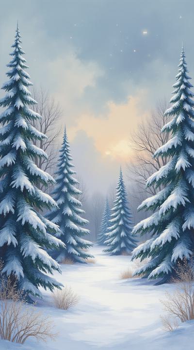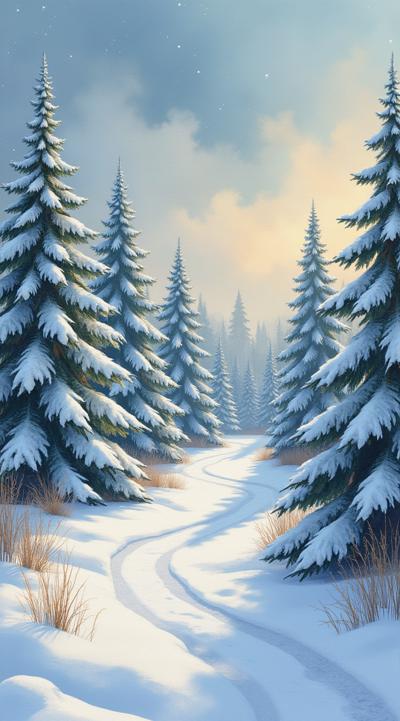 Зимний сказочный пейзаж. всё занесено снегом, стоят несколько больших, покрытых снегом, ёлок. нарисовано акварельными красками. легкий стиль старых советских открыток.