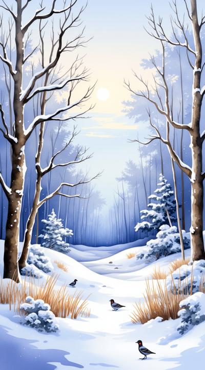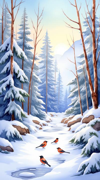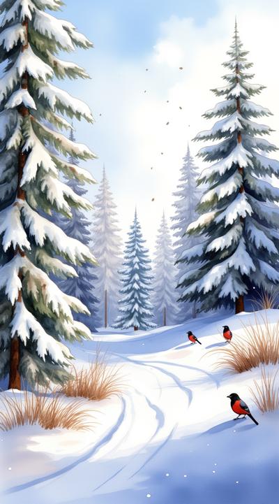 Сказочный зимний пейзаж. снегири. Солнечный день. Занесенные снегом деревья